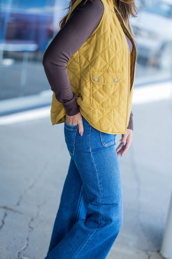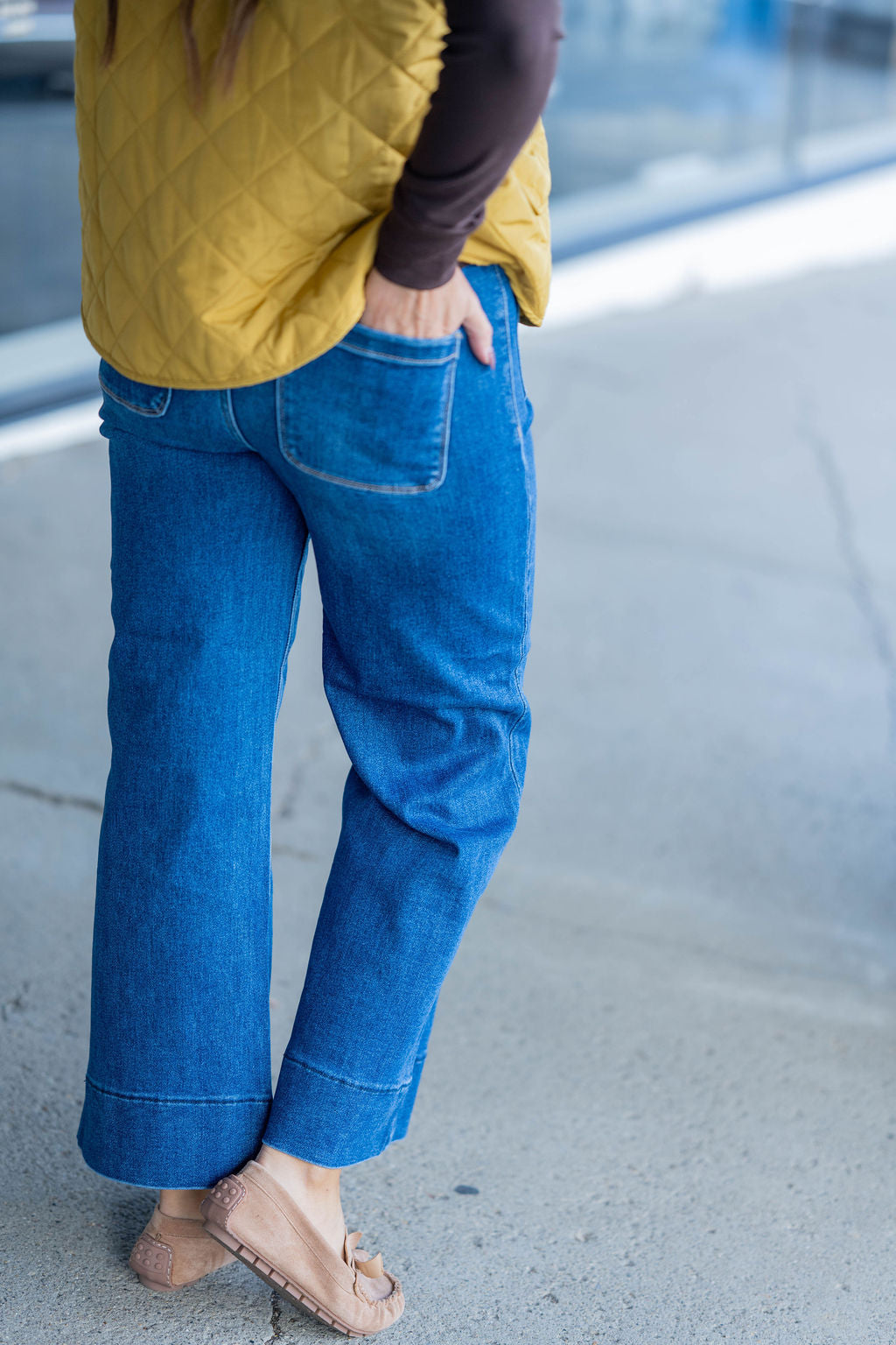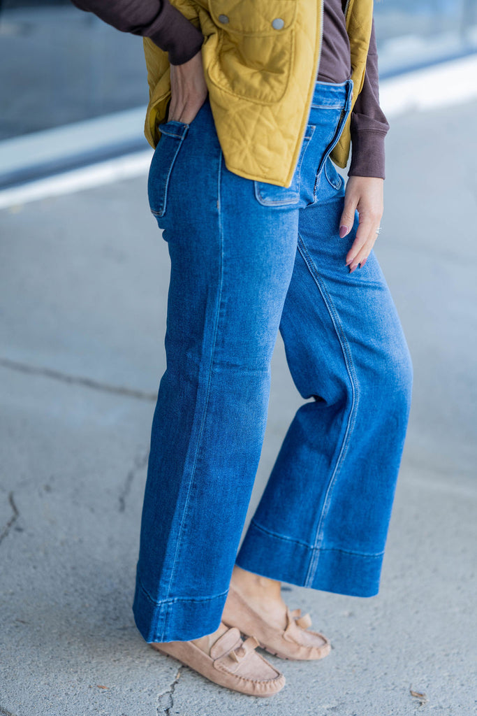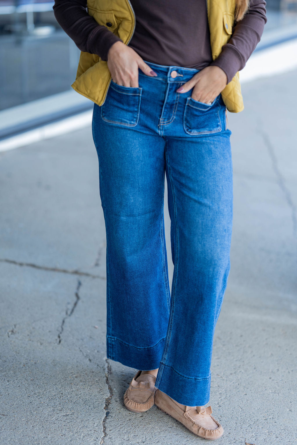 These wide-leg jeans bring a laid-back yet polished vibe to your everyday style. With front patch pockets and a rich medium wash, they balance casual comfort with a hint of retro charm.