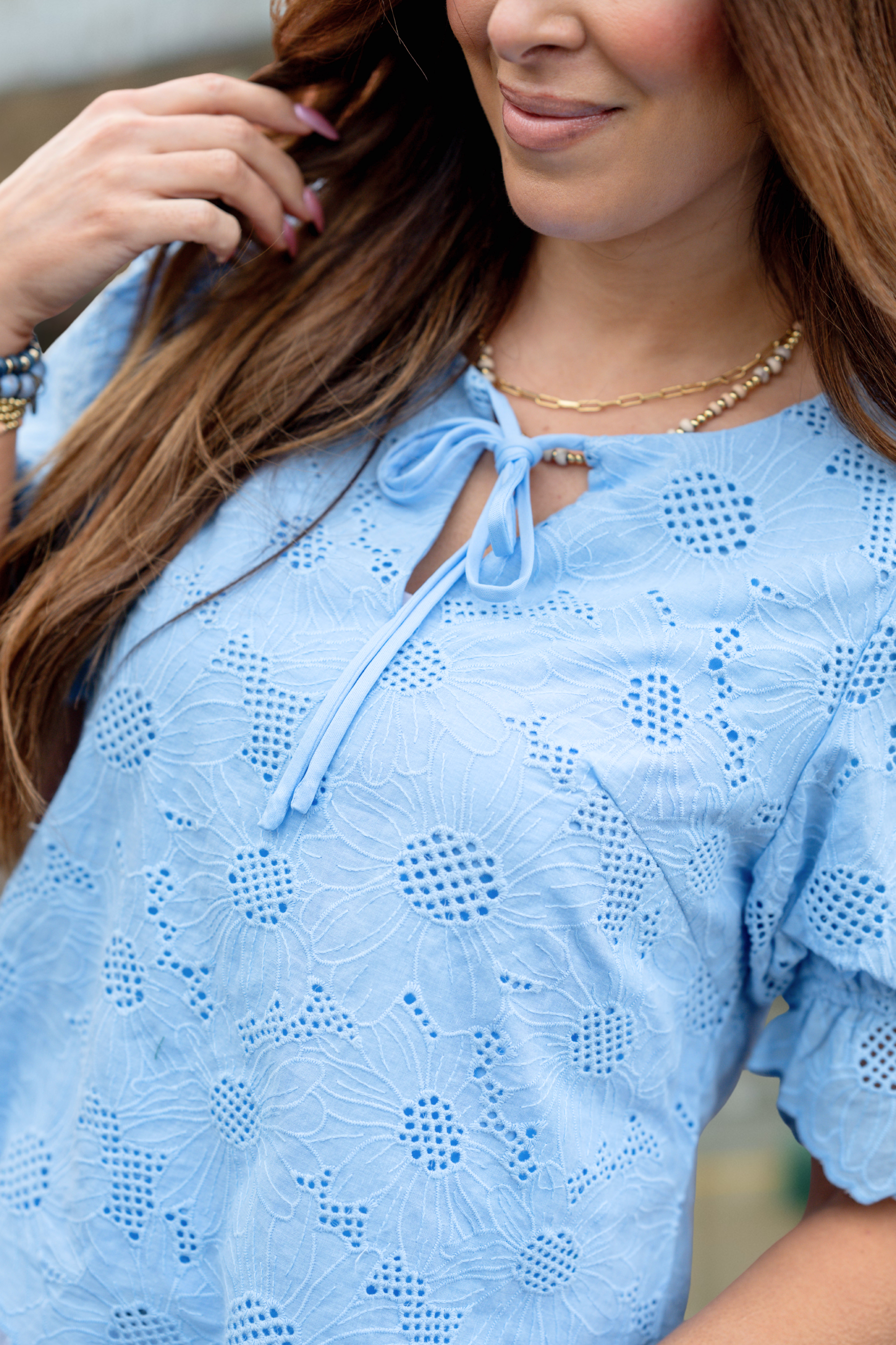 Soft, feminine, and perfectly detailed—this eyelet top brings fresh spring charm to any outfit. The intricate floral embroidery and scalloped hem keep things beautifully delicate, while the puff sleeves add a playful, flattering touch.