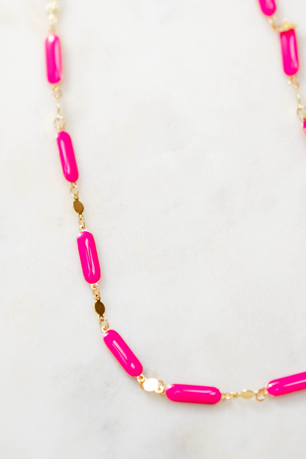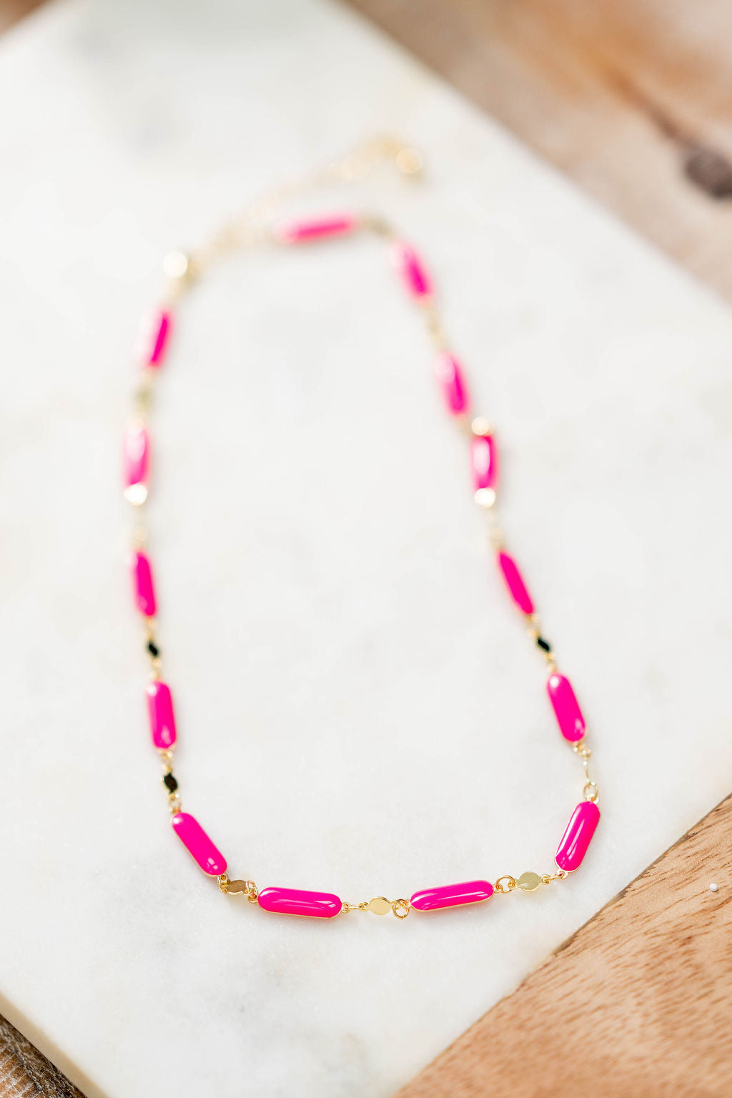 This necklace is playful, vibrant, and unapologetically bold—just like your favorite pop anthem. Featuring glossy pink cylinder beads paired with golden links, this necklace is a statement piece that instantly brightens your look. Perfect for layering or wearing solo, it brings a fun, modern edge to any outfit.