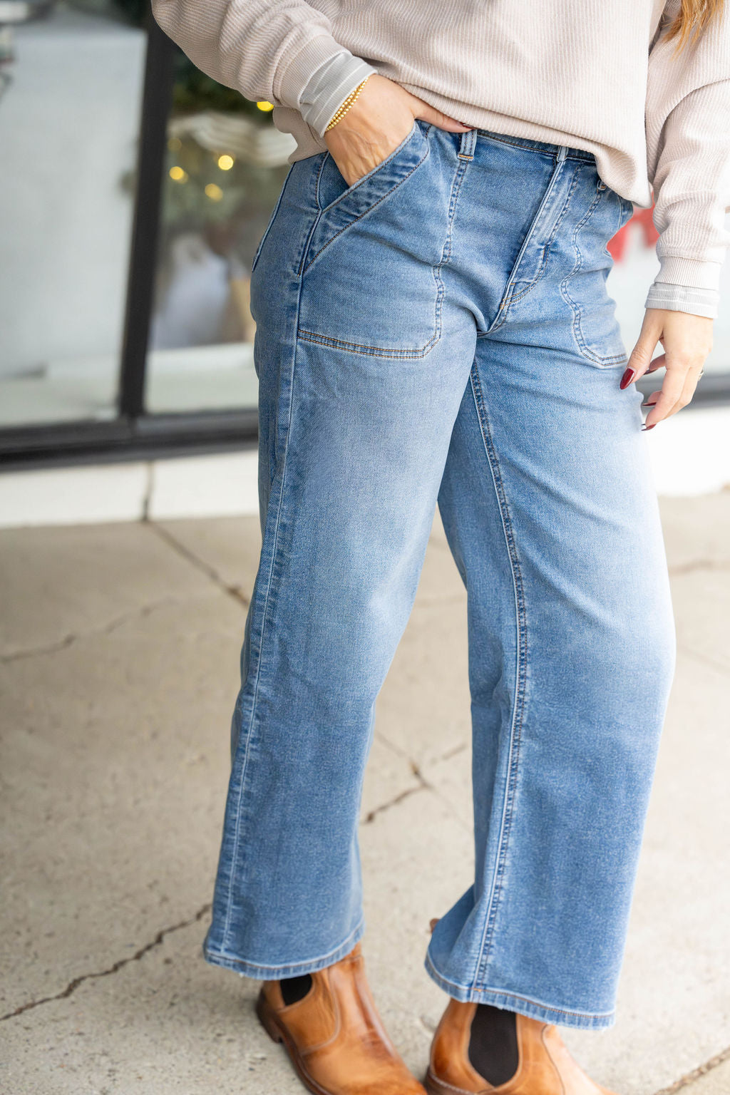 Make a statement in these ultra-cool wide-leg jeans, designed with a bold silhouette and a standout frayed hem. The medium wash keeps them easy to style, while the dramatic leg shape adds instant personality to any outfit. Soft stretch denim gives you comfort you can count on, and the raw-edge details create that perfectly lived-in look.