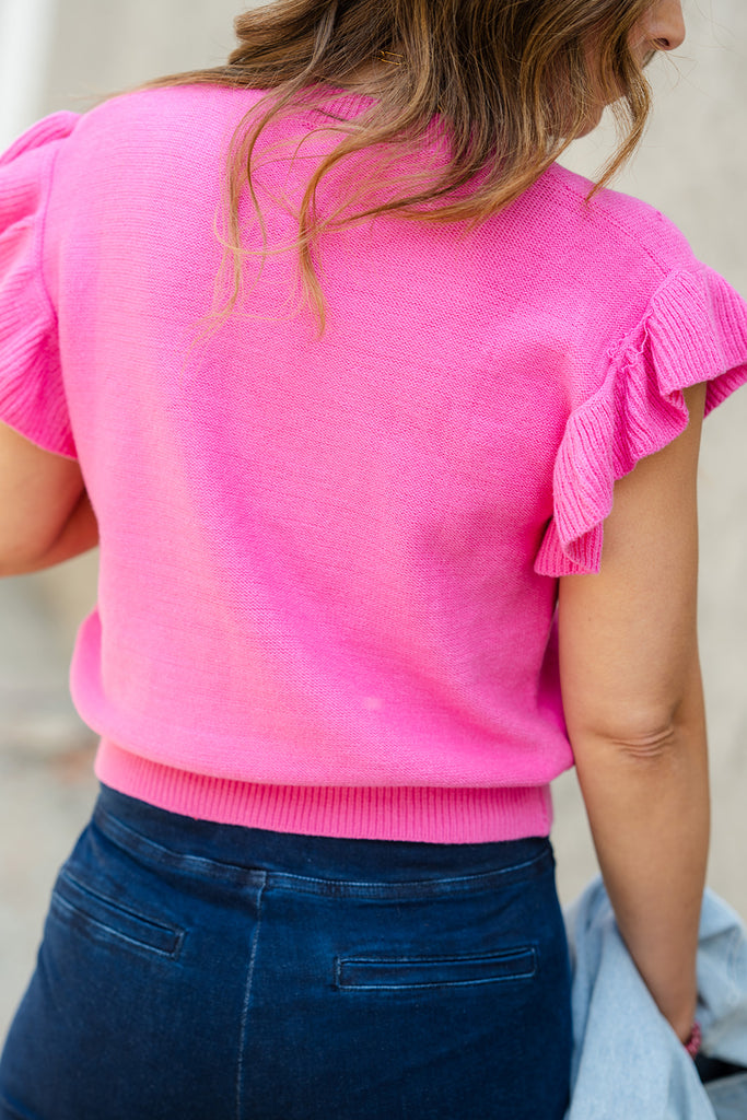 We love this unique tee! The ribbed ruffle accents make this a must-have! Wear alone with shorts or a skirt in the warmer months or use as a layering piece for your cardigans, blazers, or shackets in the cooler ones!