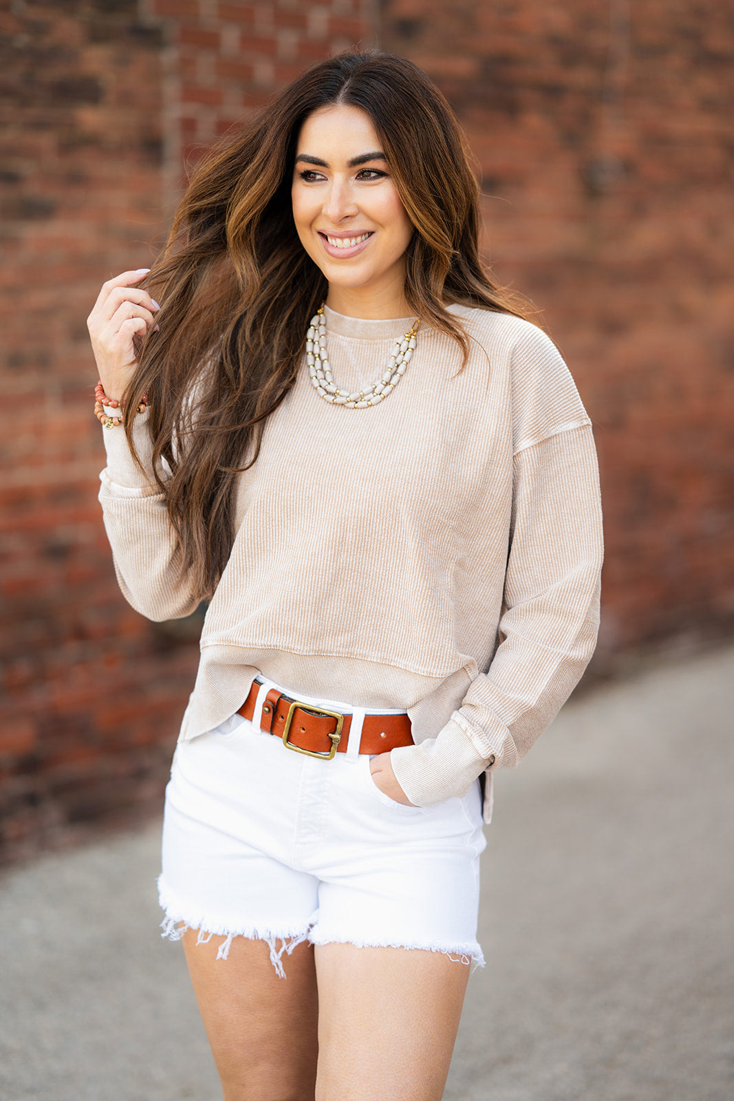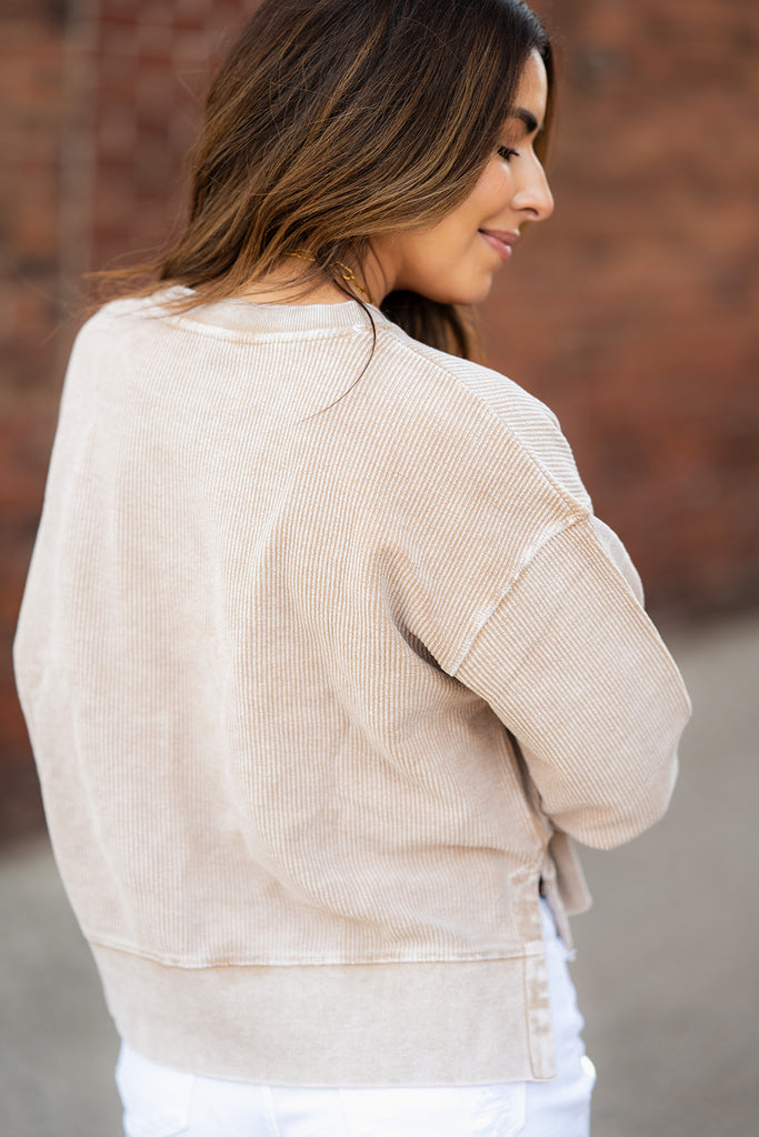 Comfort meets style in this ribbed sweatshirt! The lightweight and soft textured material gives a fun texture to any look, and the side slit detailing is perfect to pair with leggings, denim, or joggers! Chilly? Layer with a vest or shacket!