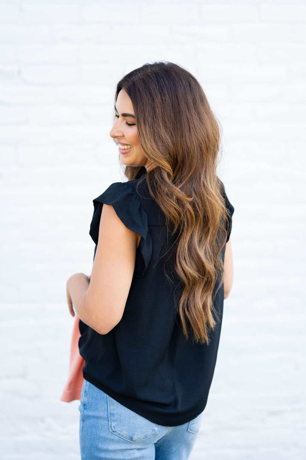 A blouse that's perfect for everyday wear with it's fun ruffle accents and button top detailing! The lightweight and breathable material makes this ideal for the warmer months with shorts or a skirt but this can be layered for the cooler ones as well! The simplicity of this blouse allows you to dress this up or down with ease!