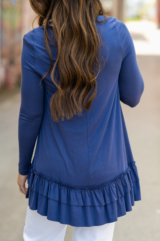 We're swooning over this tee! The soft and lightweight material and double ruffles on the bottom give this such a fun and flirty vibe! Pair with shorts in the warmer months or denim in the cooler! We love pairing with a bold-colored pair of our Betsey's Jeggings and your favorite accessories to complete the look!
