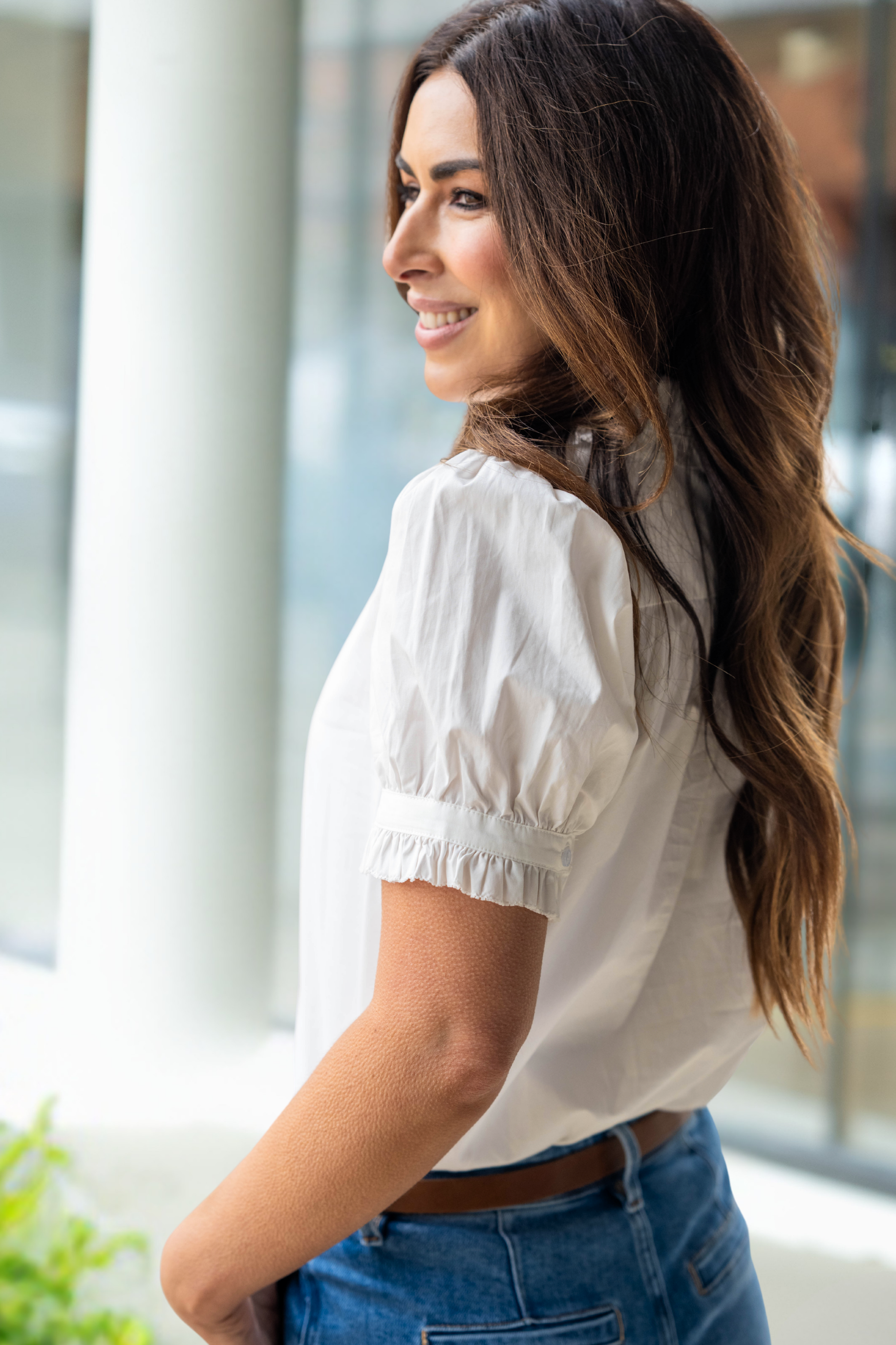 Meet your new polished-but-pretty staple. This button-front top features a sweet ruffled collar, subtle pleated sleeve detail, and a crisp poplin feel that instantly elevates any outfit.