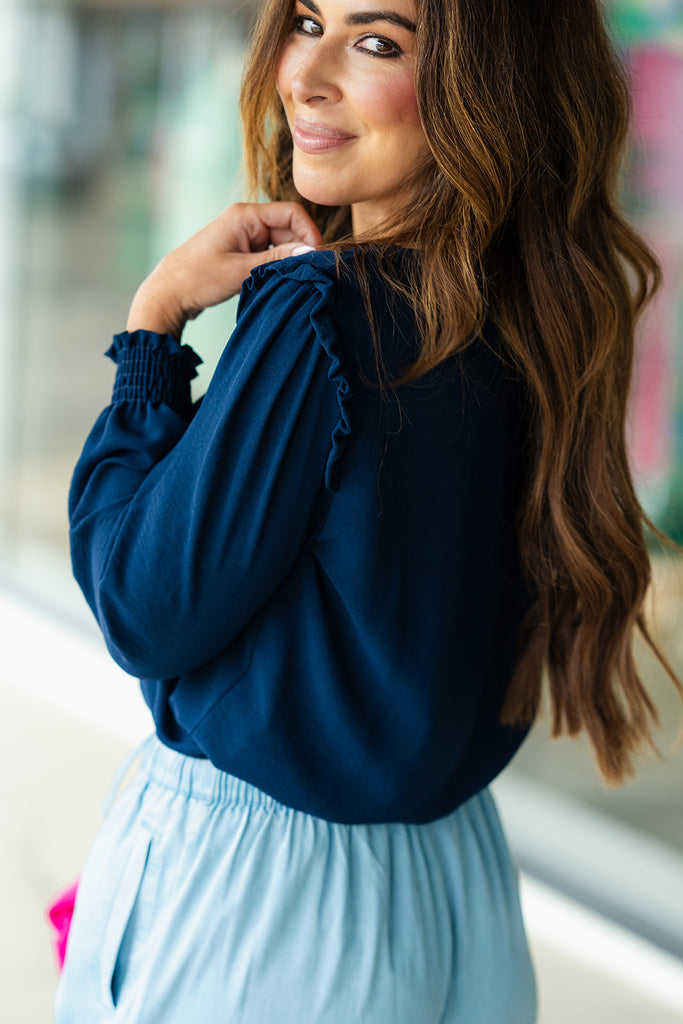 A simple long cinched-sleeved blouse with a fun added ruffle detailing to make it unique! Pair this with shorts or a skirt in the warmer months or with a cardigan or blazer in the cooler ones! This blouse is so easy to dress up or down with the addition of your favorite accessories!