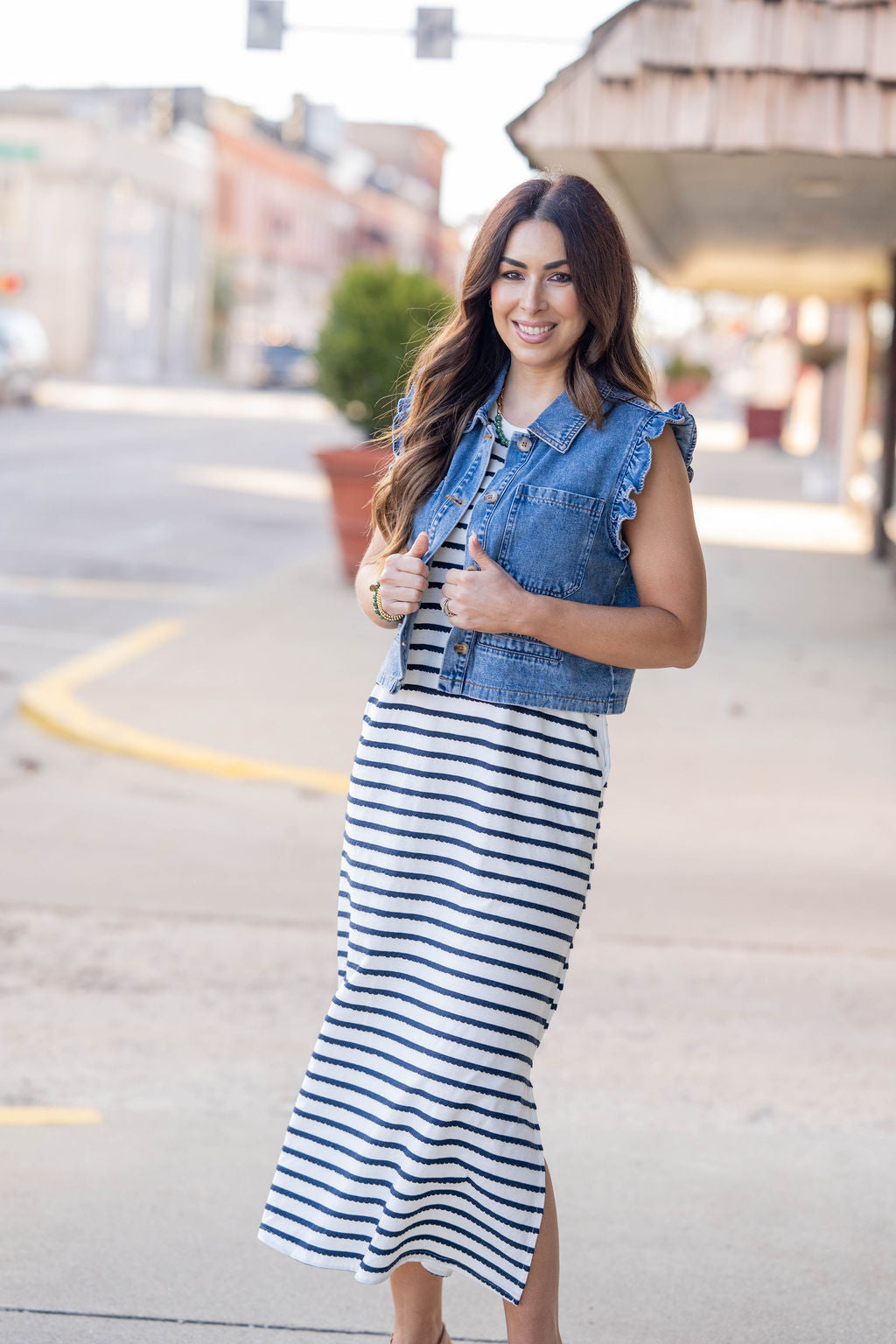 Add a touch of warmth and style to any look with this vest! The ruffle trim really POPS and we love how it's elevated with the pockets! Throw this on over a dress, blouse, basic or graphic tee, anything!
