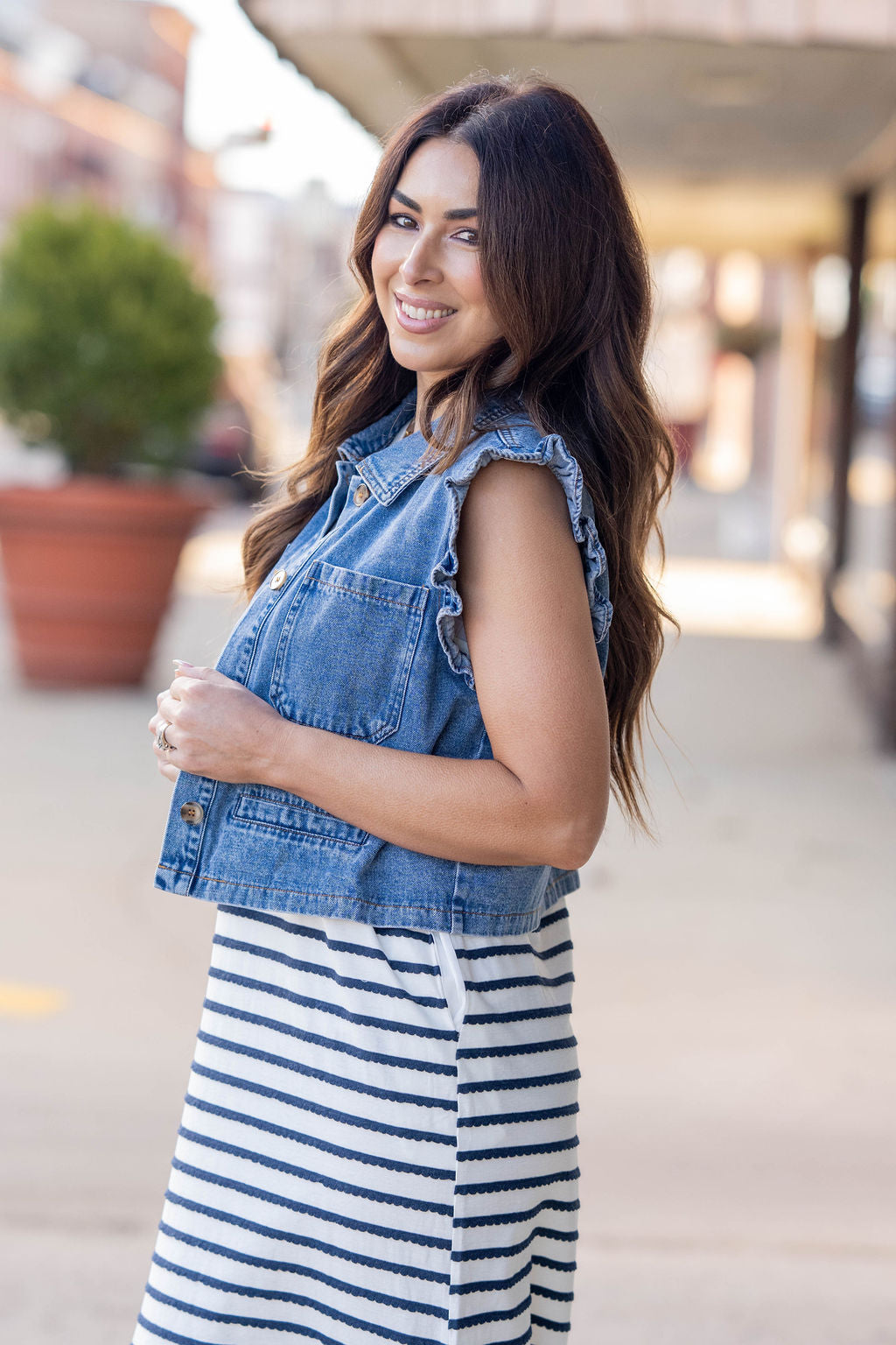 Ruffle Trim Pocket Denim Vest