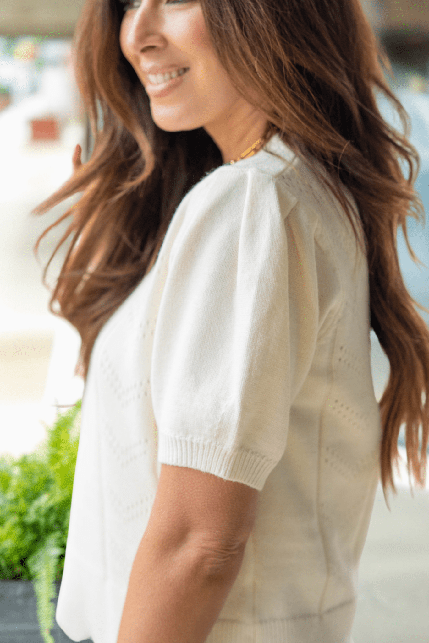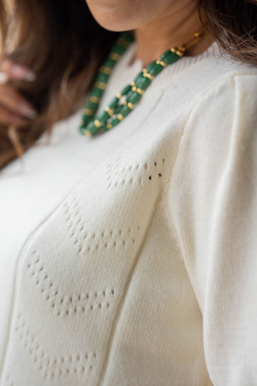 - Subtle pointelle detailing throughout