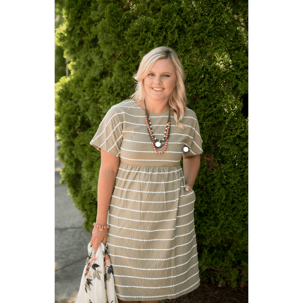 We are loving the current scallop trend! This dress is a t-shirt style dress with beautiful scalloped horizontal stripes and pockets. This can easily be paired with a bold printed kimono, or even just a colored cardigan and statement necklace to fit your style.
