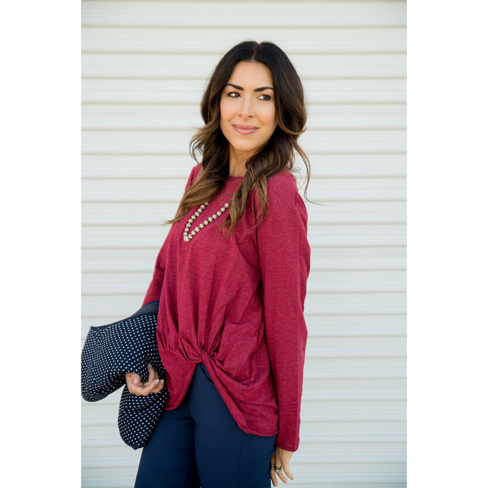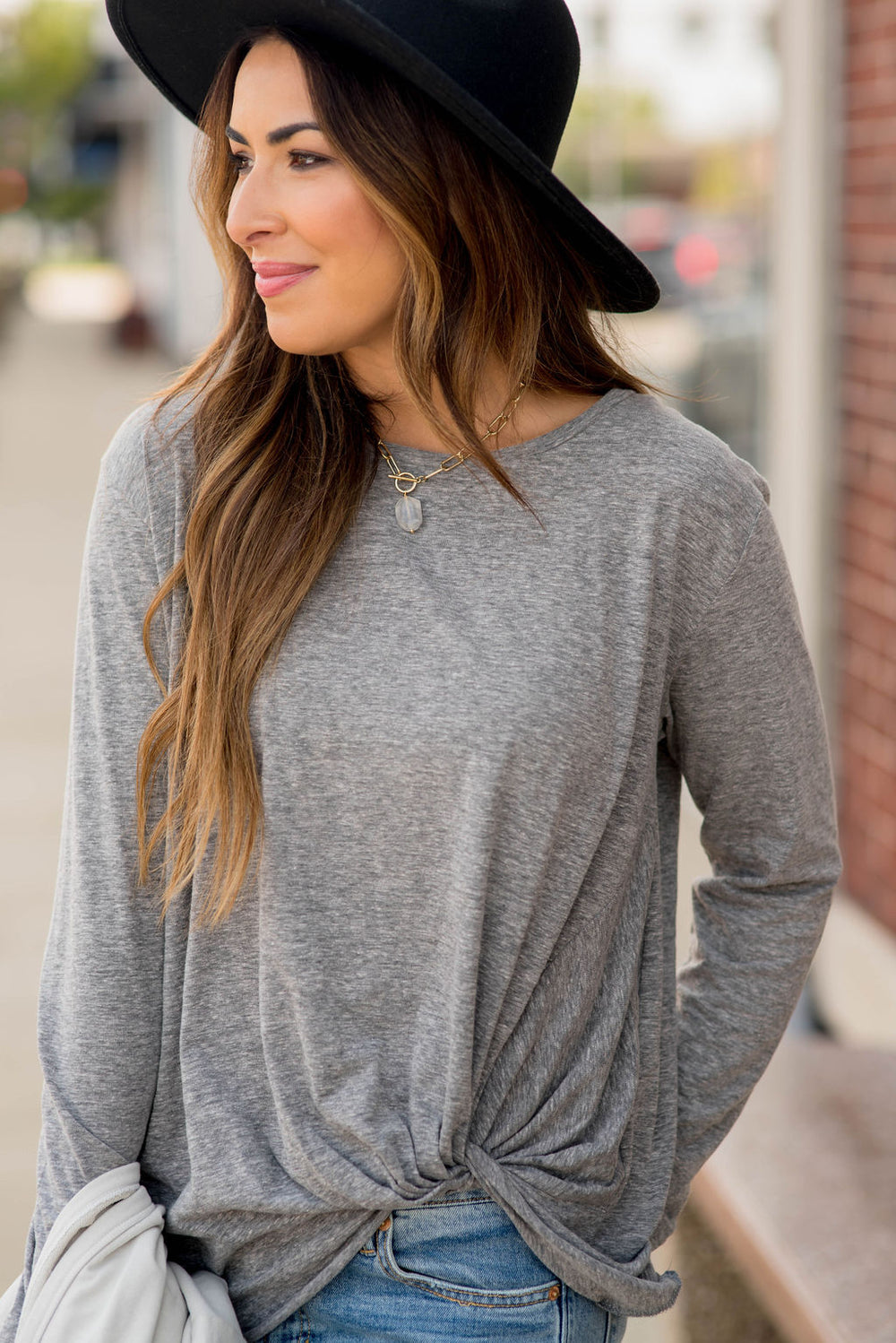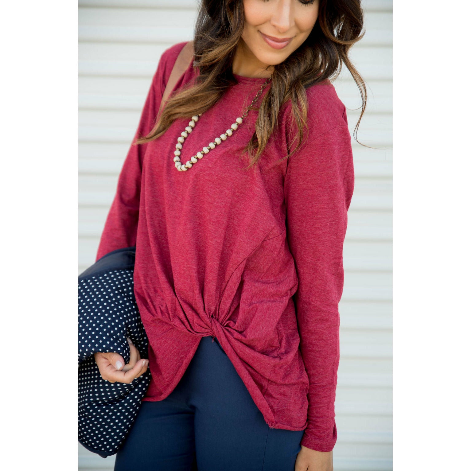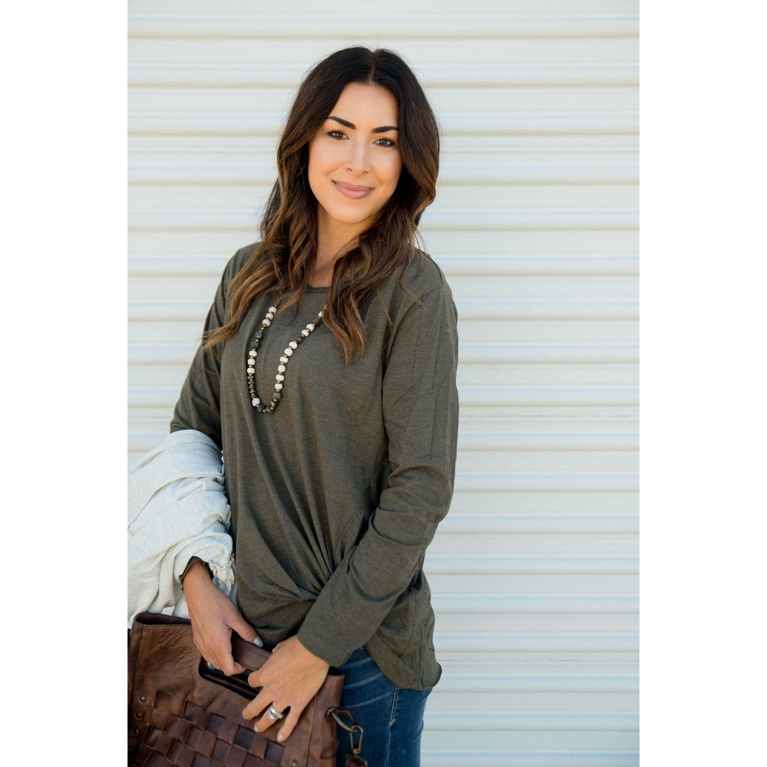 A simple long sleeve tee elevated with a cute side knot accent! This tee is sure to be a staple in your closet with how easy it is to style them! Be sure to snag one in every color!