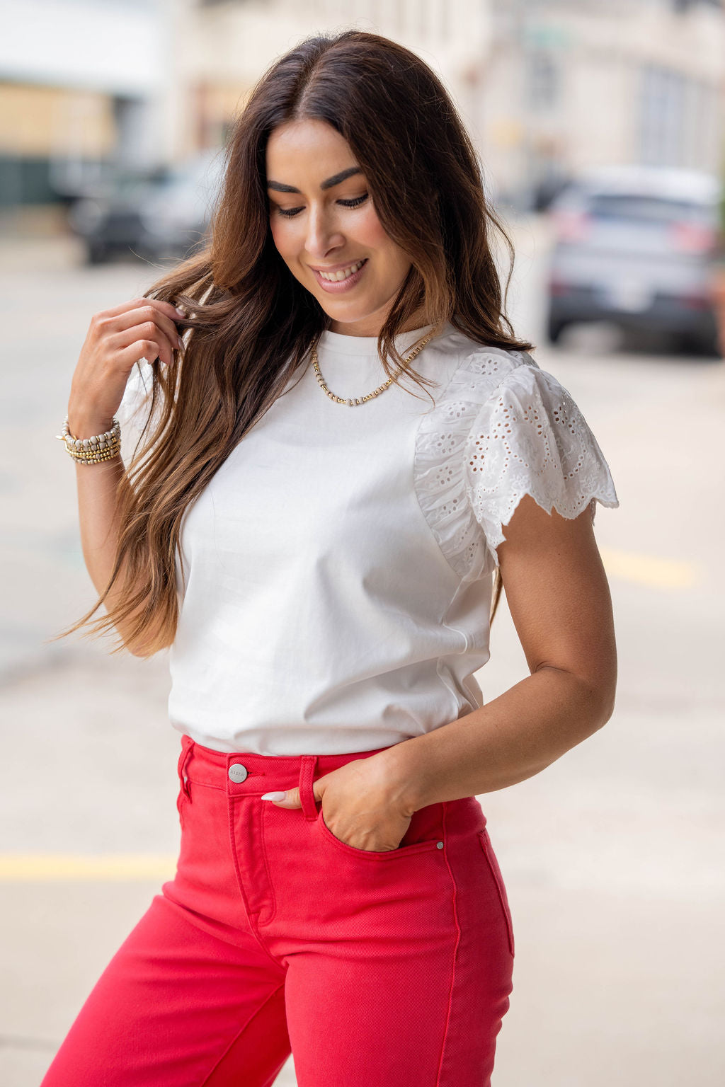 Feminine details meet everyday comfort in this effortlessly pretty top. Designed with a soft, smooth knit body, it’s elevated by delicate eyelet ruffle sleeves that add the perfect touch of texture and charm. The relaxed fit makes it easy to wear, while the subtle statement sleeves give your look a polished, put-together feel.