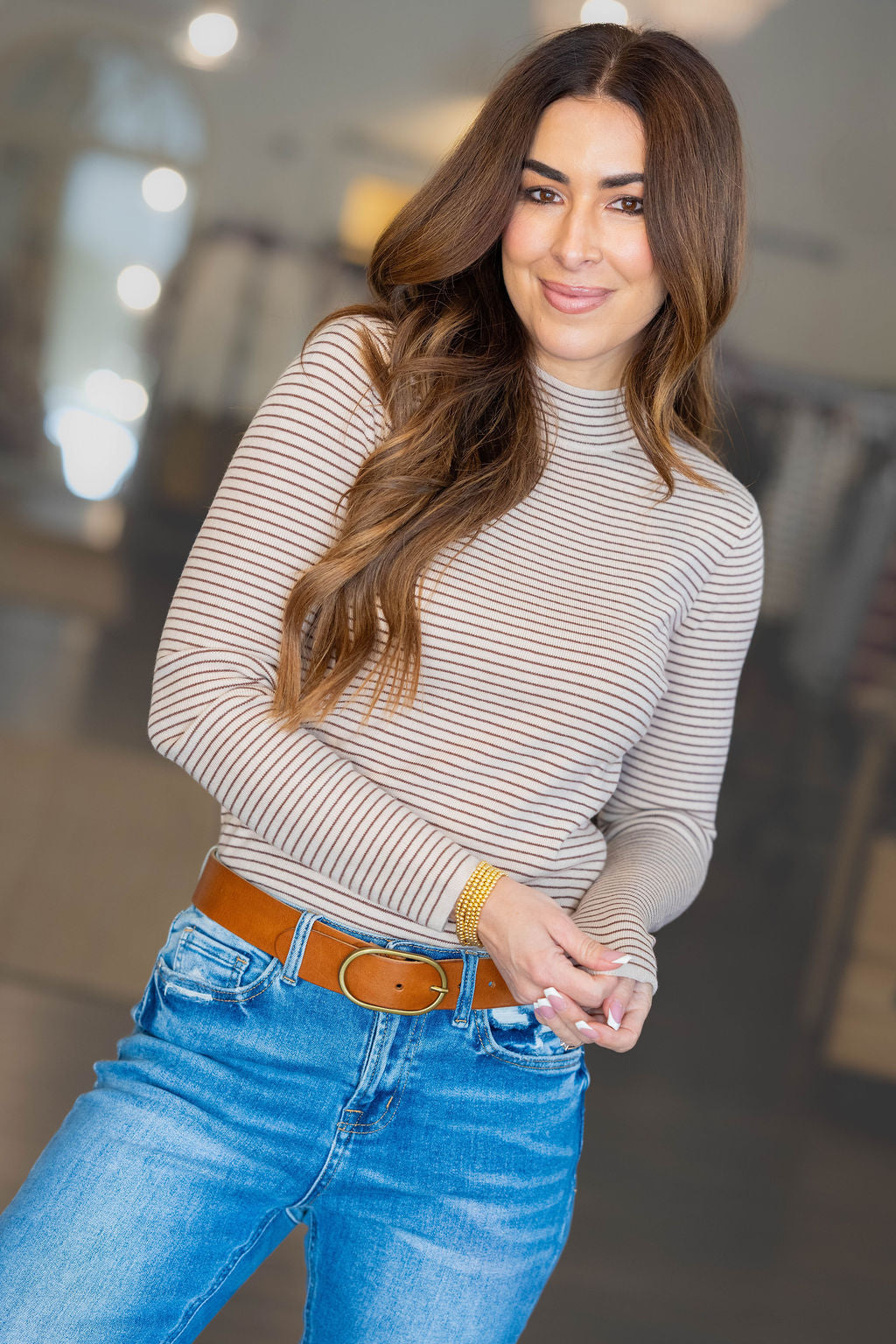Simple, sharp, and endlessly versatile. This striped long sleeve features refined lines and a streamlined fit that makes styling feel effortless.