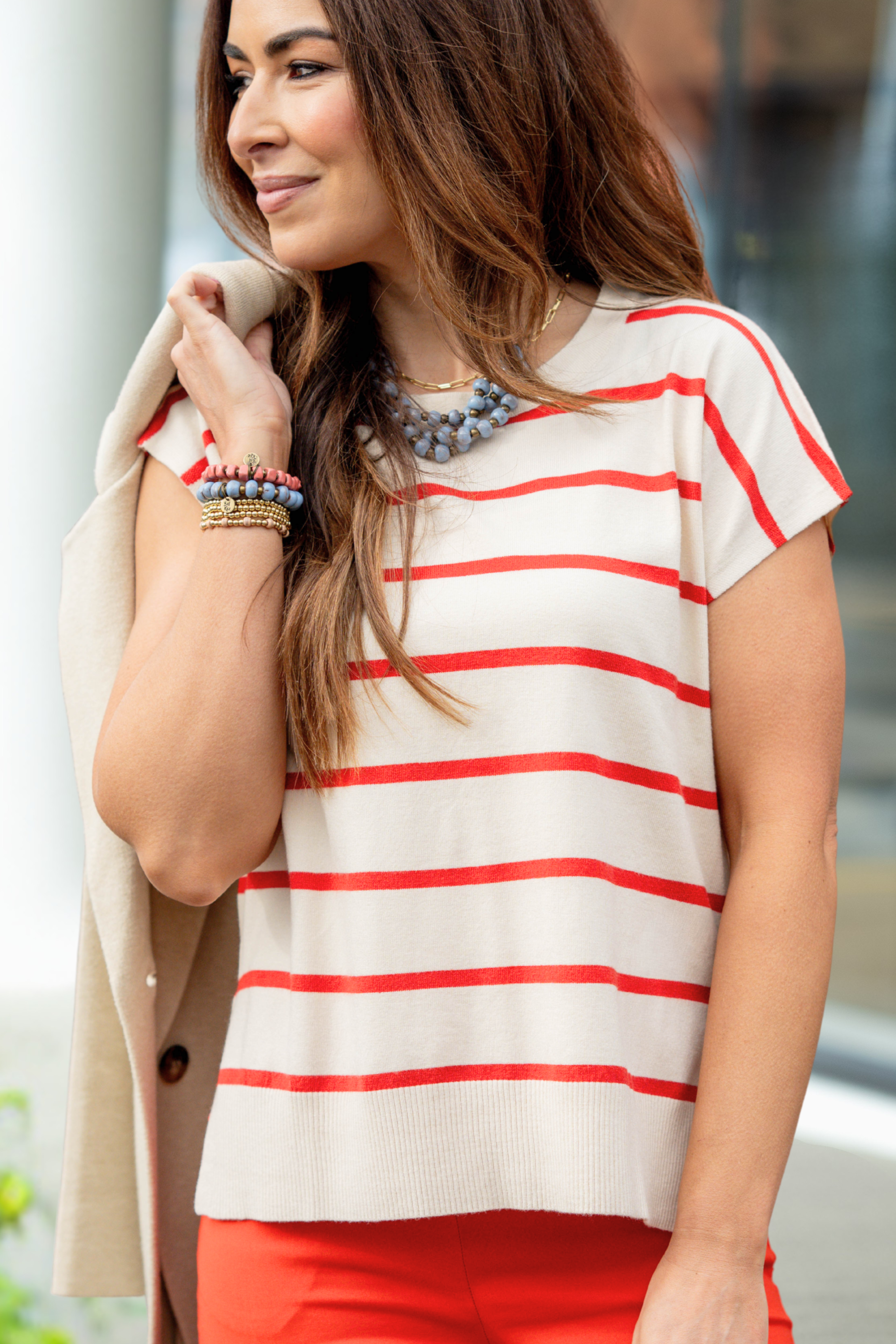 A simple soft tee with classic stripes to give it a chic vibe! The knit feel can be either dressed up or down to match your style! We love that this can be worn with shorts for the warmer months or denim, joggers, or our Betsey's Jeggings for the cooler ones. Chilly? Add a blazer, cardigan, or jacket with ease! Simply add your favorite accessories to elevate this piece.