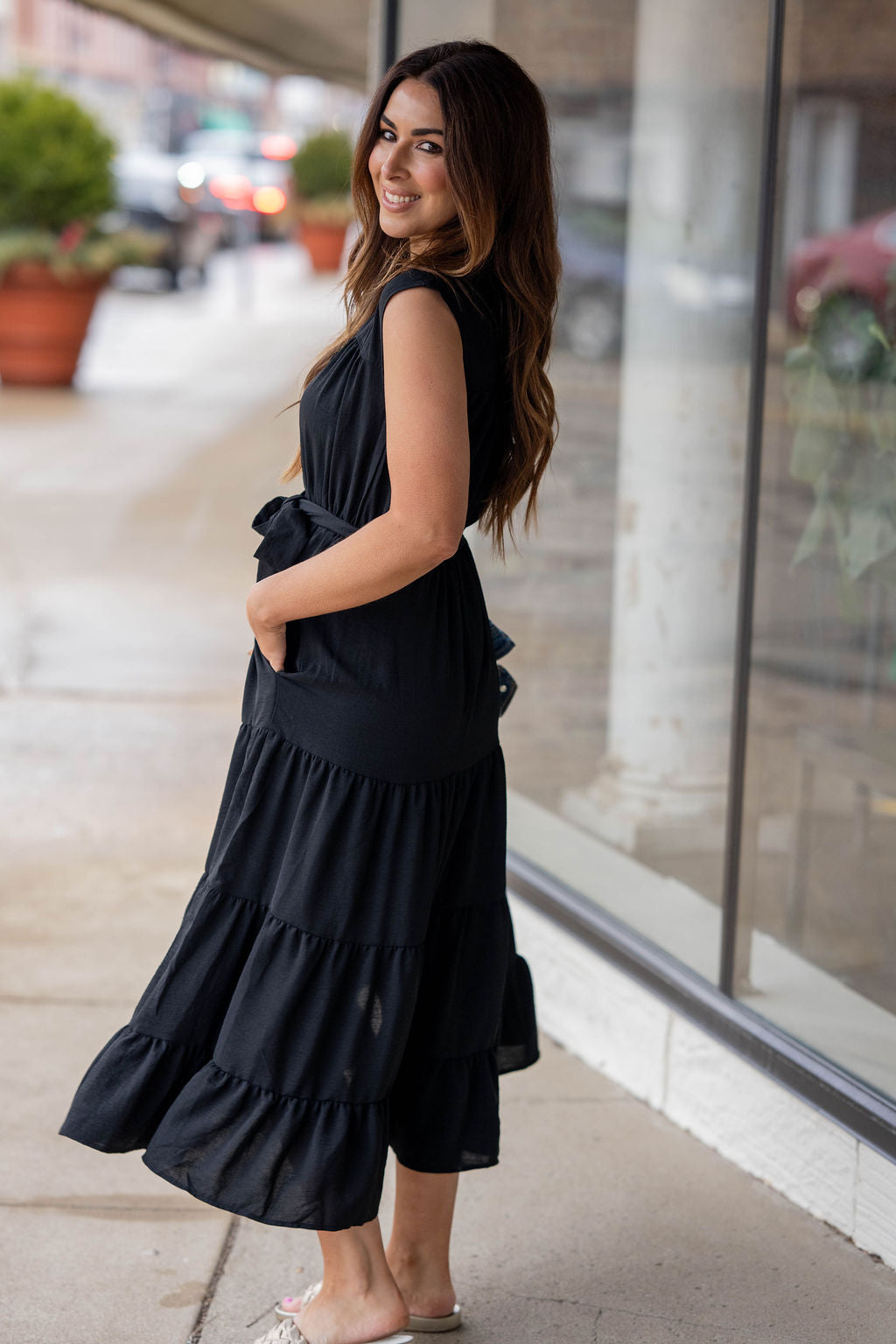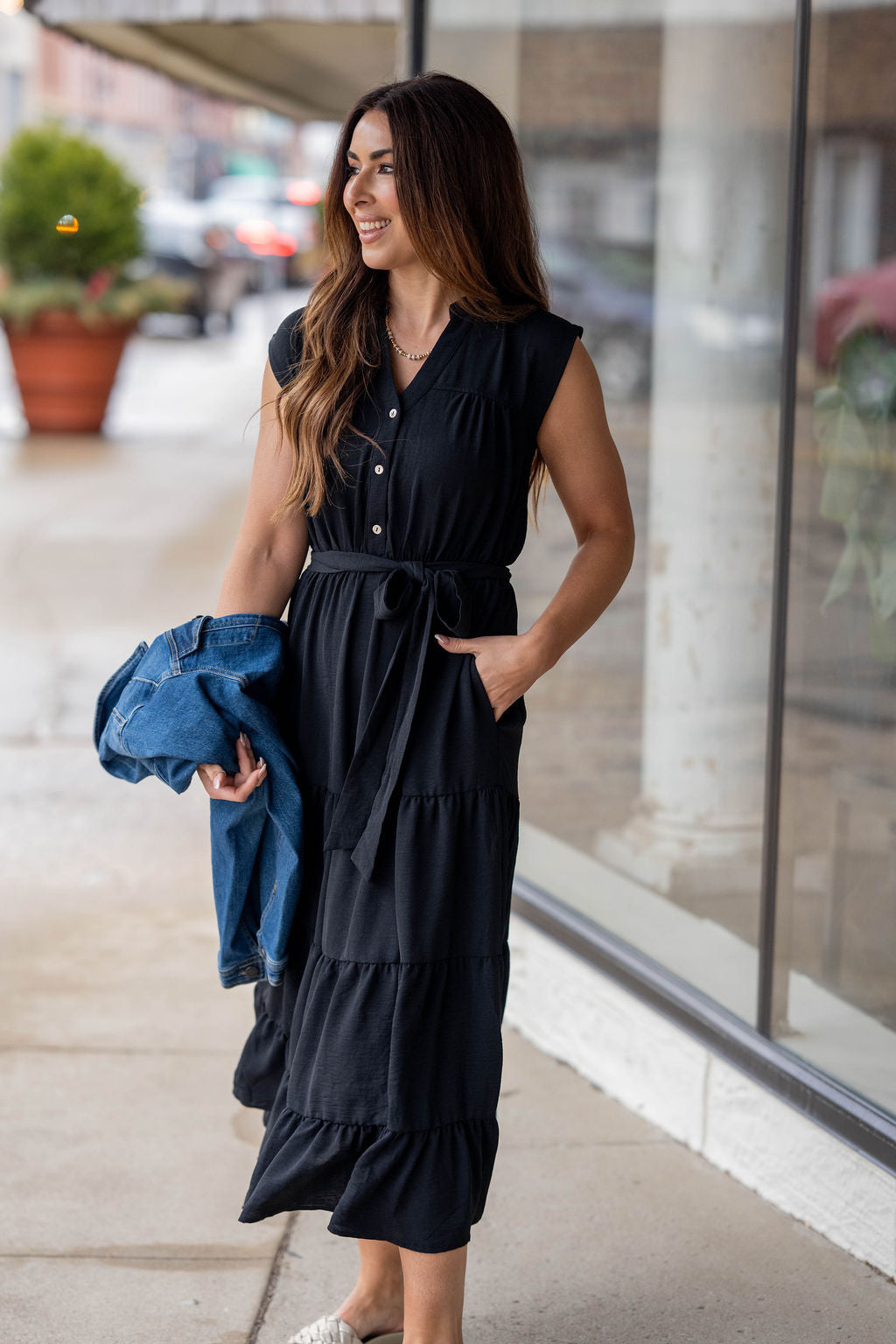 A beautifully flowy dress made to take you from errands to evenings out with ease. This tiered silhouette offers a flattering shape that moves with you, while the button-front bodice and tie waist add the perfect touch of soft structure.