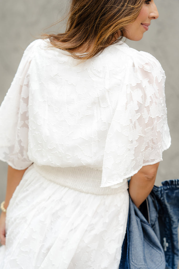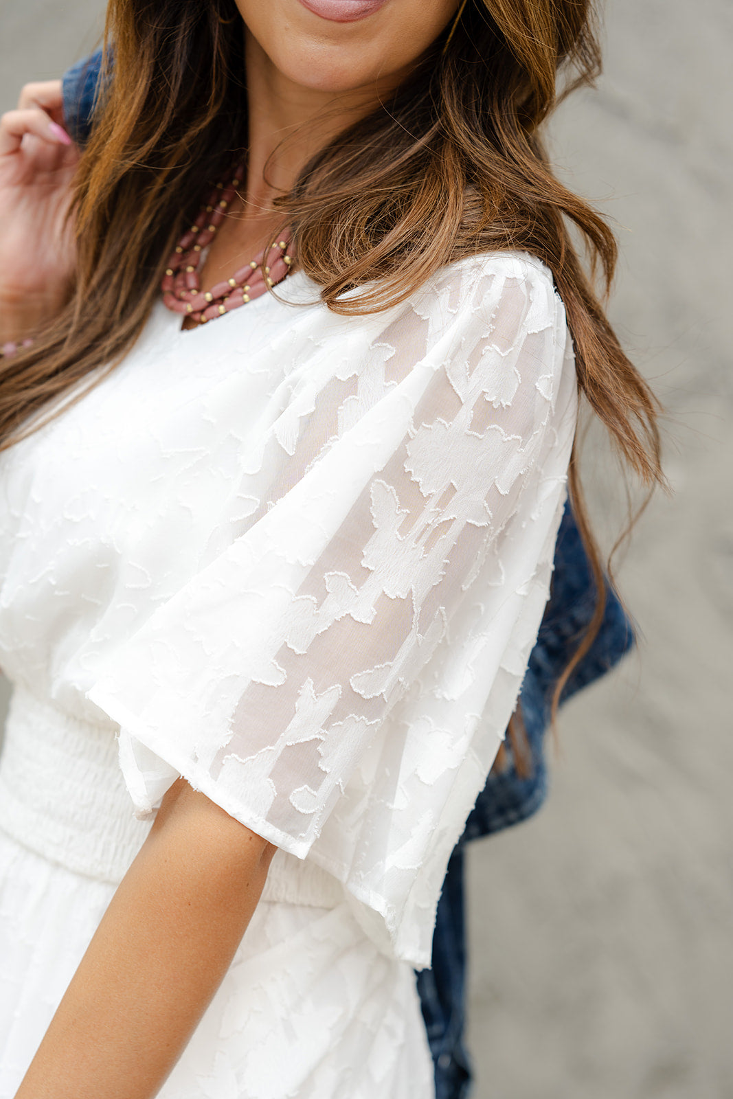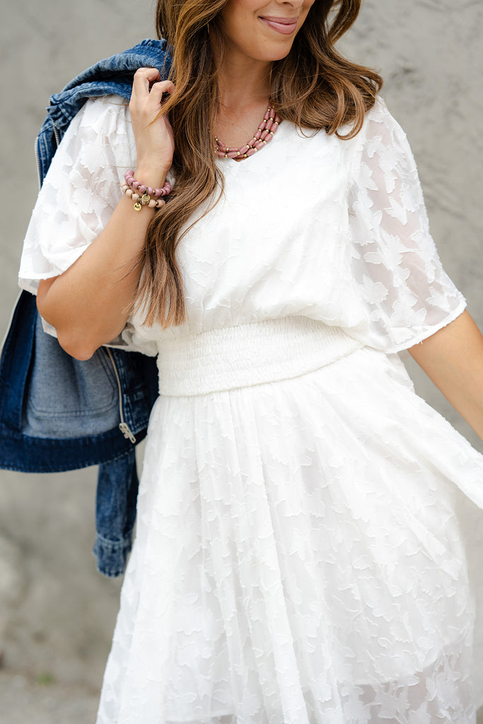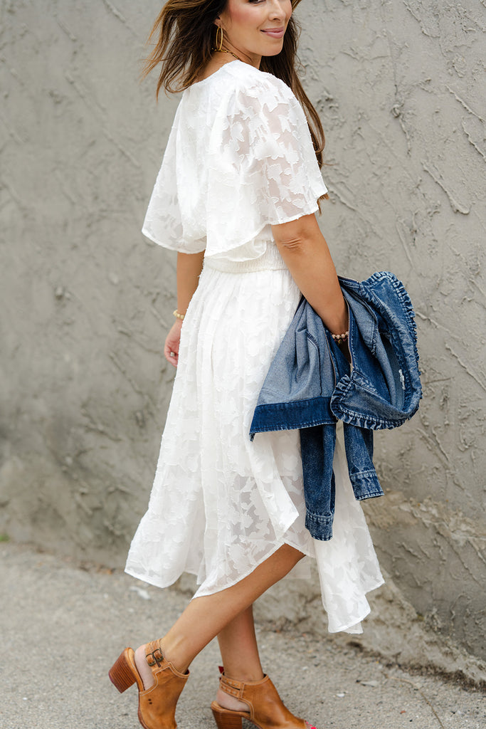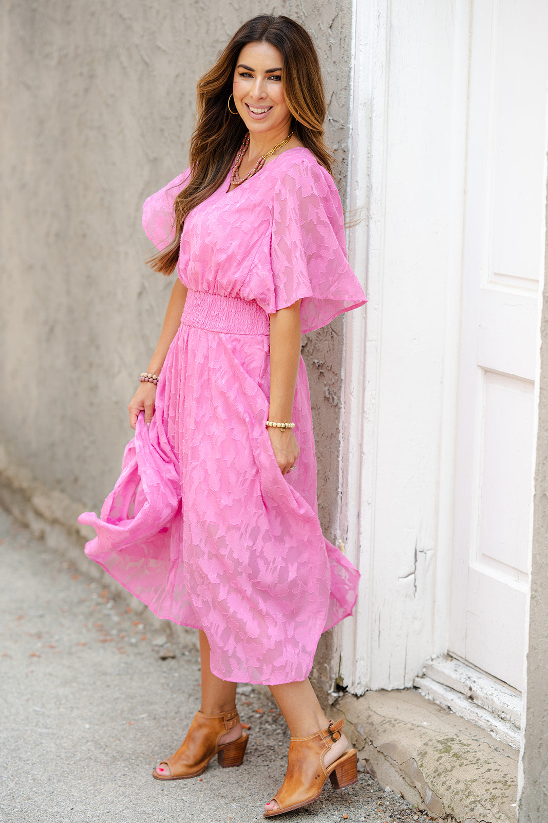 This is the perfect dress for any occasion. The midi length is appropriate for any event, and the lightweight material, side slit, and flowy fit is great for any season. Wear on its own with the cute fluttery sleeves for the warmer months, or pair with a colored cardigan and a pair of booties for the cooler ones. We know how matter you wear this, you will make it fit your style!