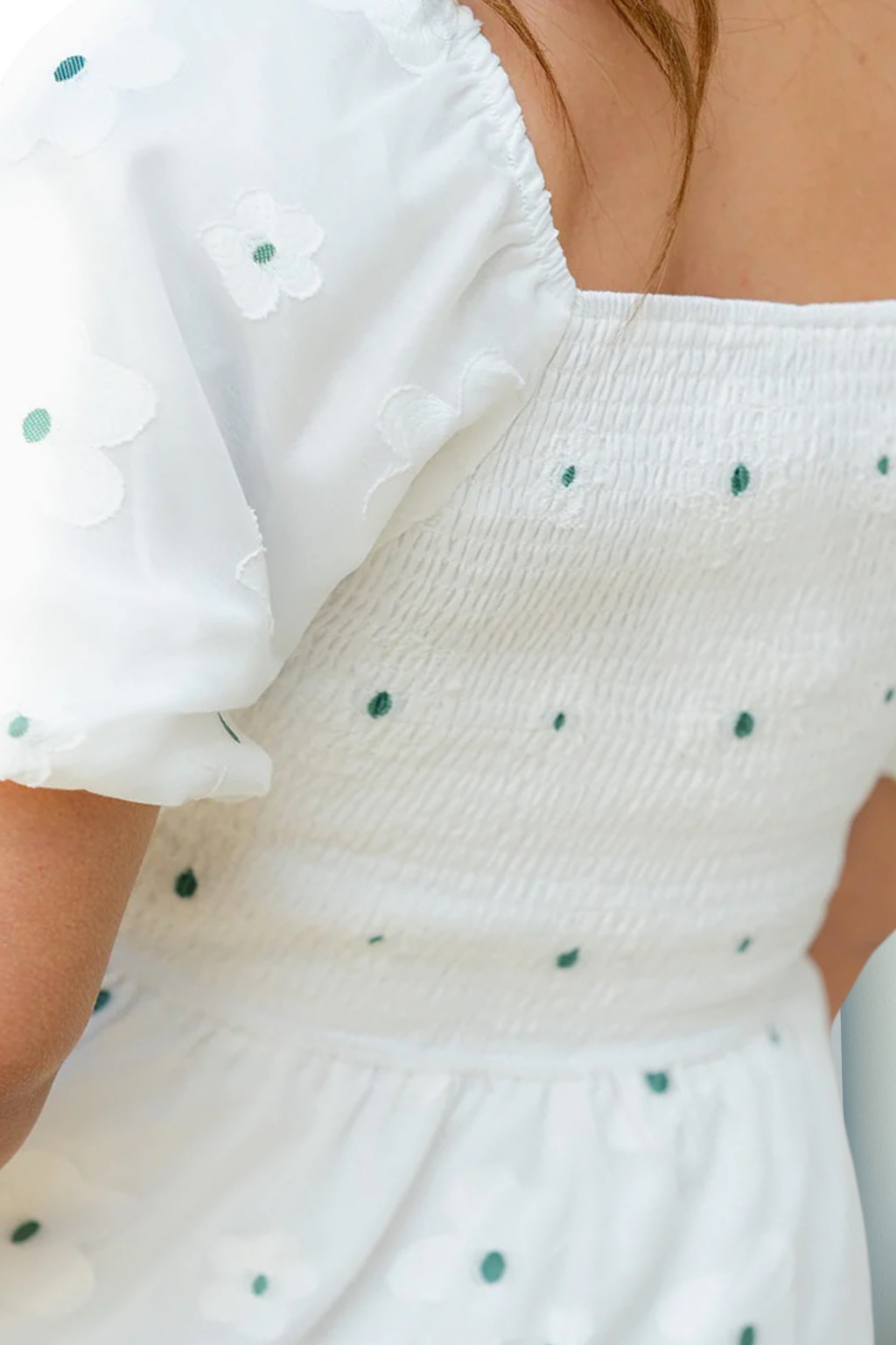 This dress gives us major feminine and flirty vibes! The lightweight and breathable material makes it ideal for those hot days but this can just as easily be layered with a cardigan or denim jacket and boots! The cinched waist gives a nice slimming effect and we're loving the puff sleeves and the subtle floral embroidery to set it apart from the rest!
