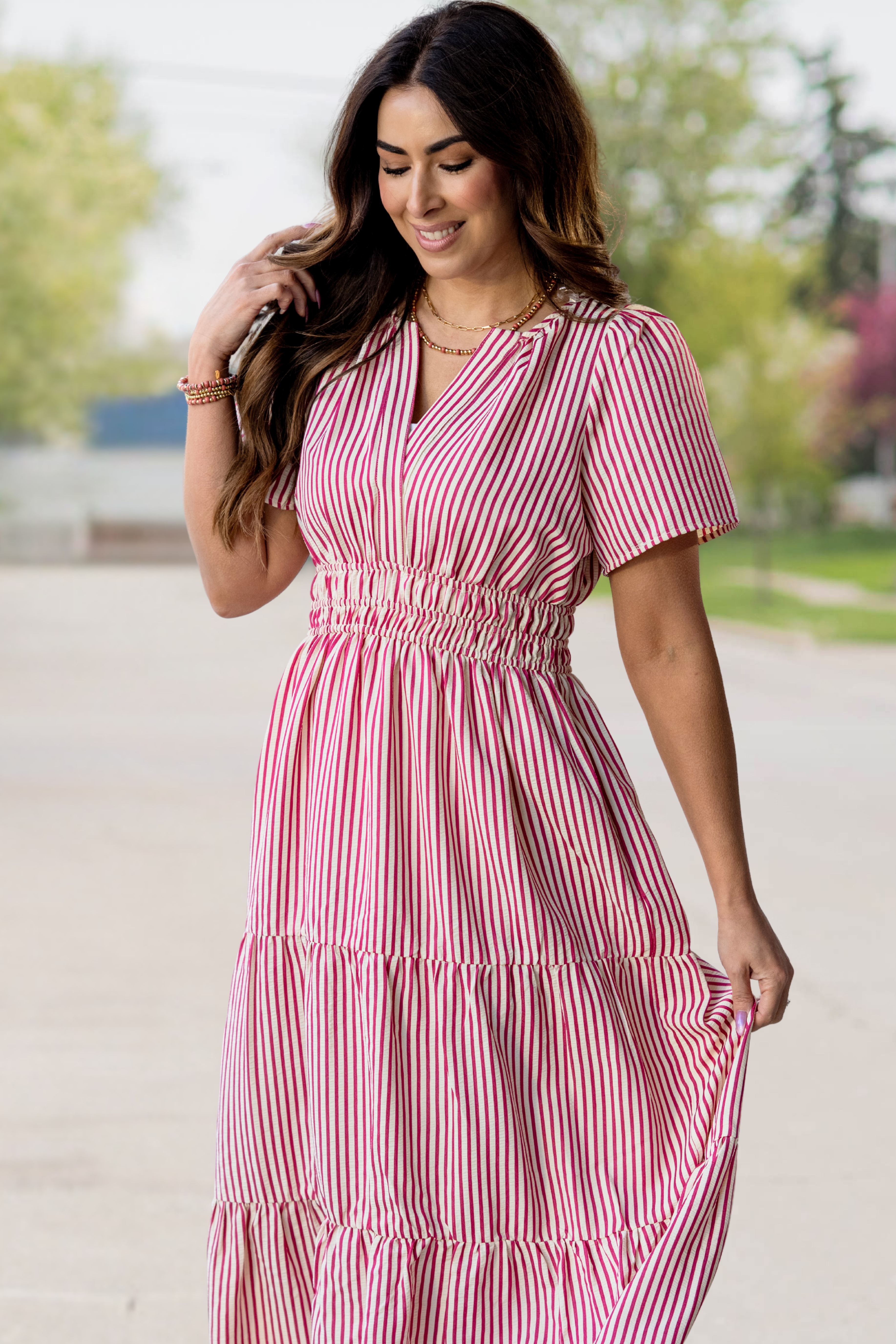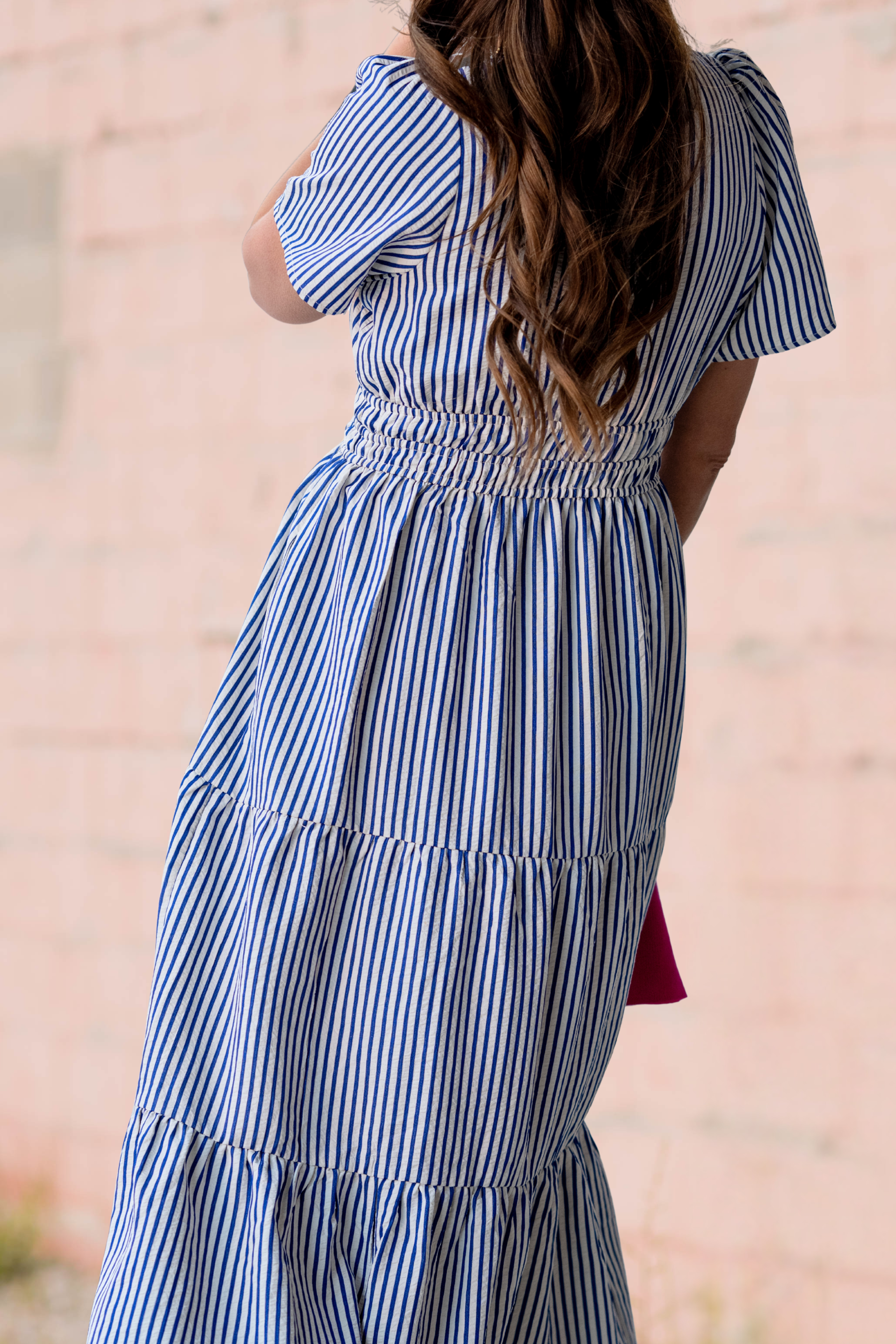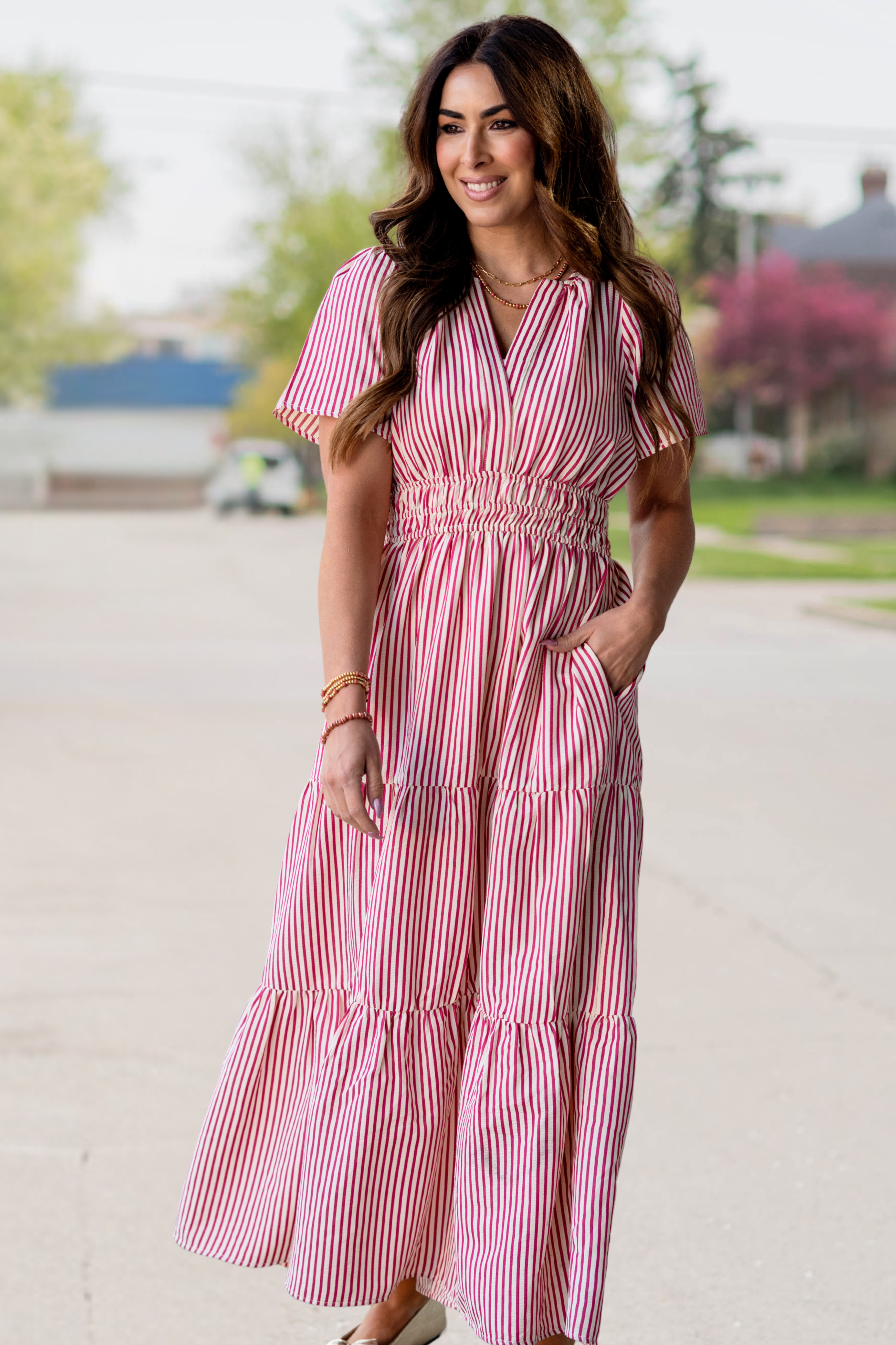 A beautifully breezy seersucker maxi with vertical stripes, flutter sleeves, and a stretchy smocked waist for the perfect flattering fit. Light, airy, and effortlessly feminine—this one is made for sunshine, strolls, and spring days out.