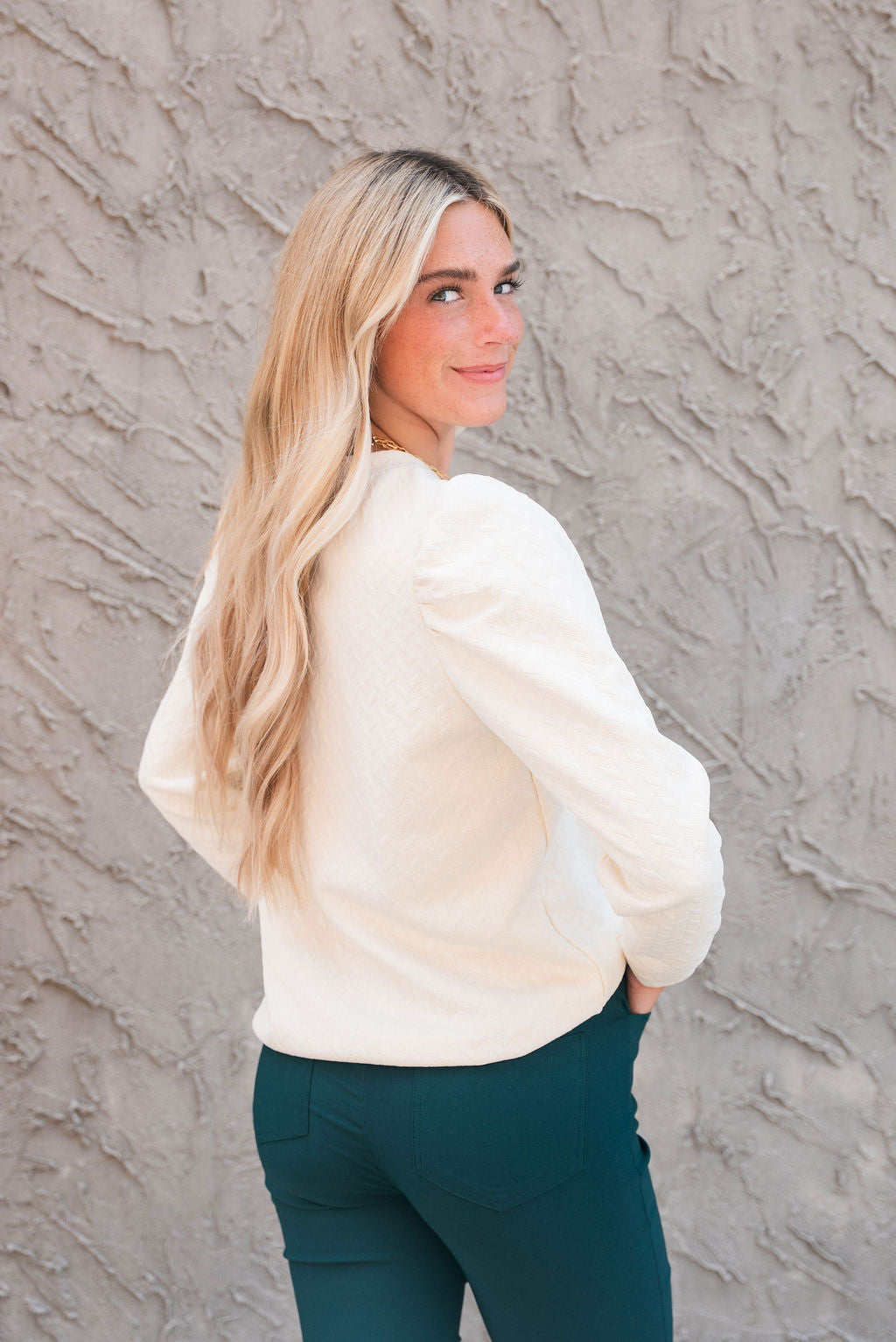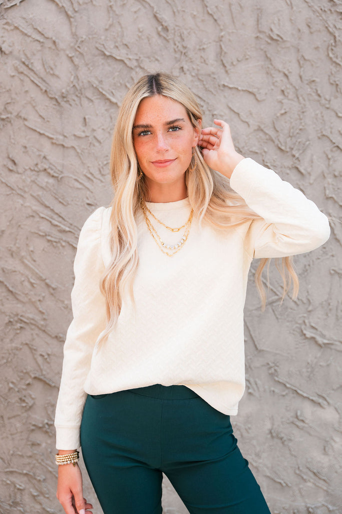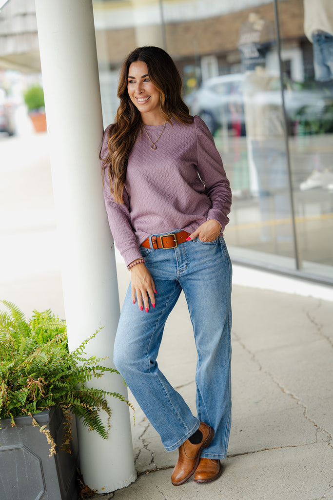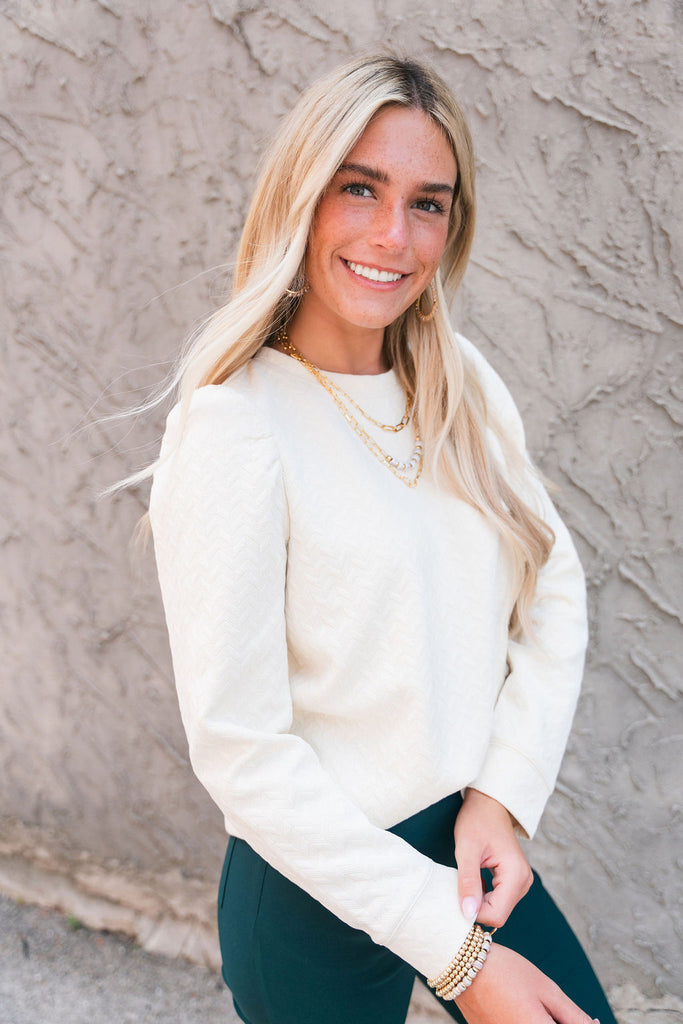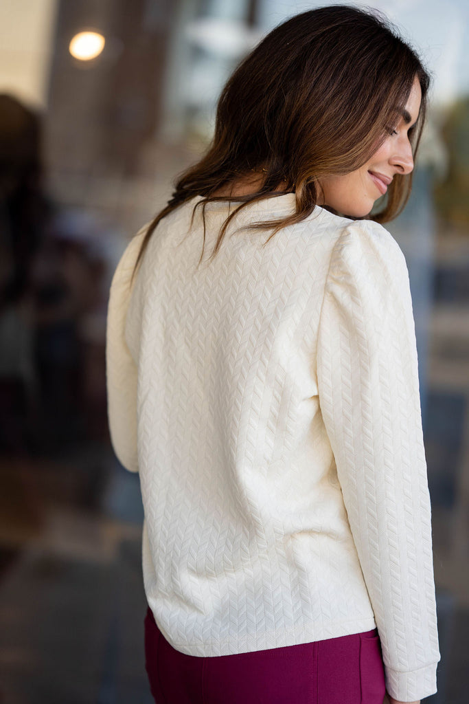 This tee is unlike all the rest! The unique textured chevron print and gathered shoulder detailing give this so much character. Pair with a skirt, your favorite denim, joggers, or our Betsey's Jeggings! Add your favorite accessories to elevate the look and make it match your style! Chilly? Add a vest or shacket with ease.
