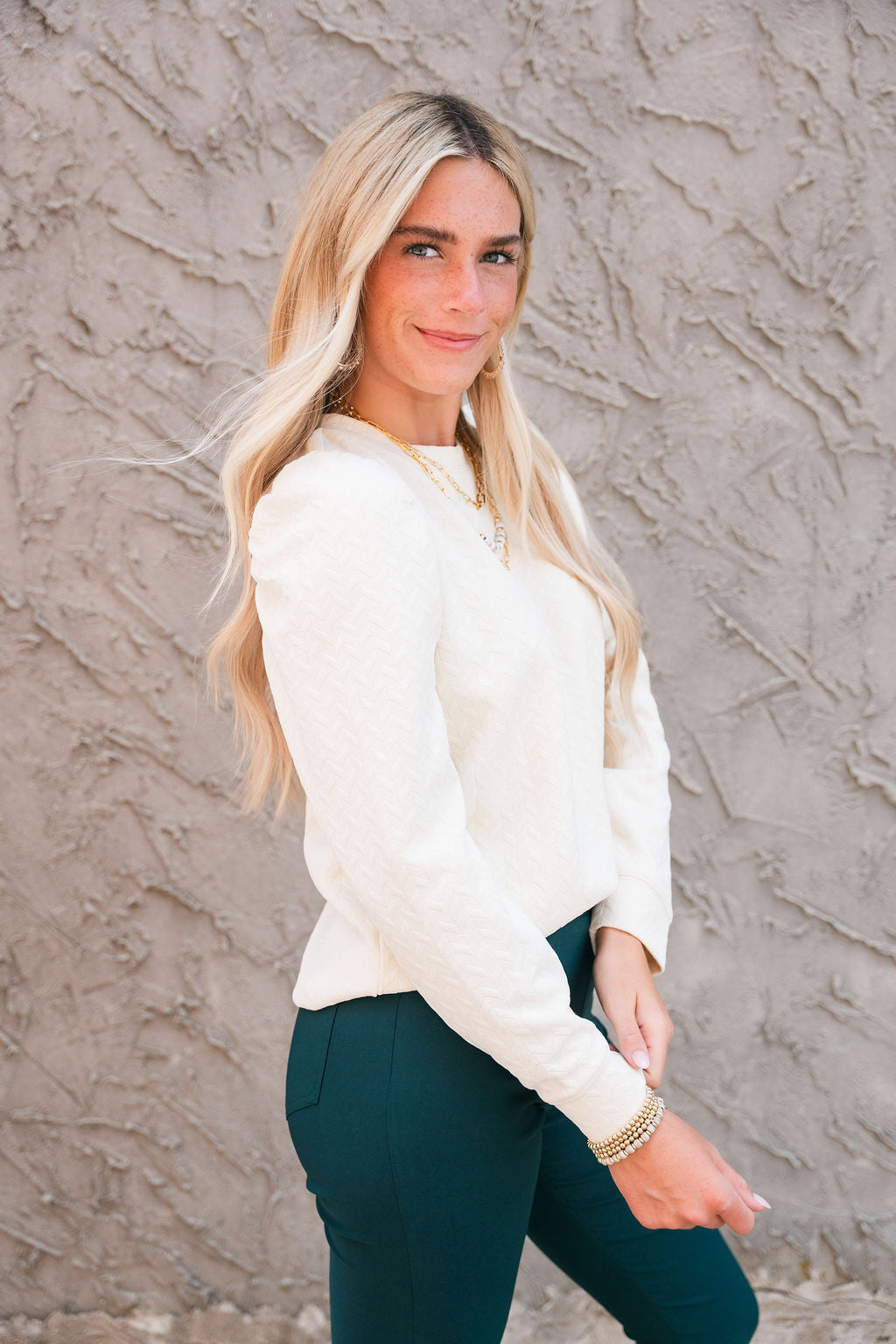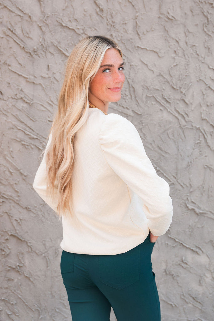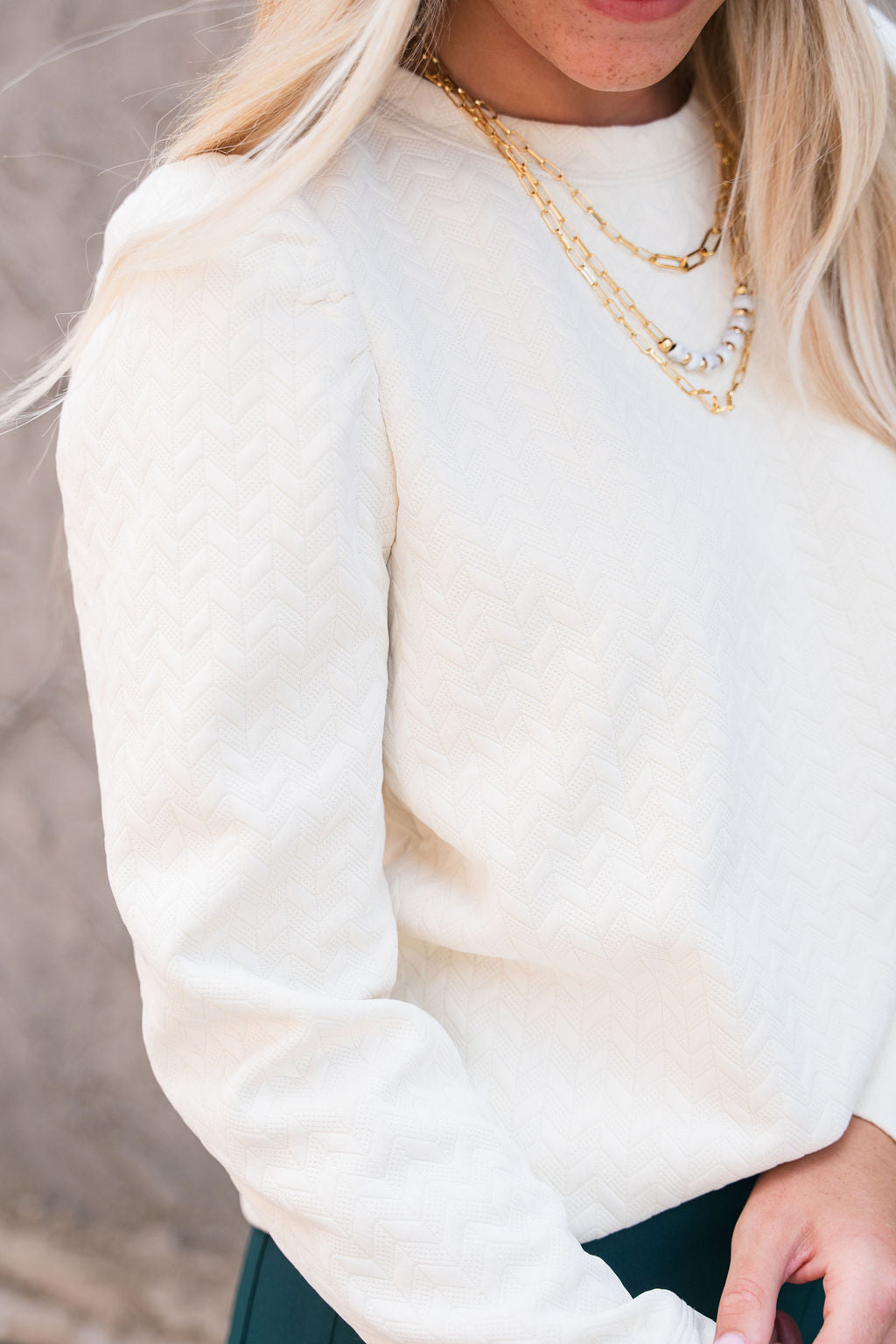 This tee is unlike all the rest! The unique textured chevron print and gathered shoulder detailing give this so much character. Pair with a skirt, your favorite denim, joggers, or our Betsey's Jeggings! Add your favorite accessories to elevate the look and make it match your style! Chilly? Add a vest or shacket with ease.