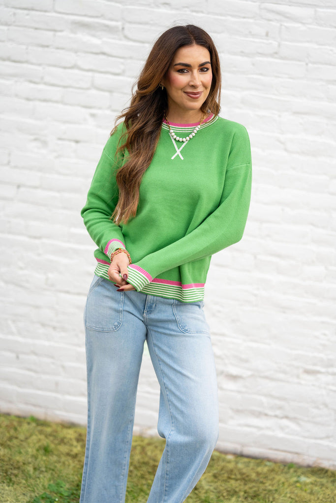 Fresh, fun, and full of personality, this sweater adds a playful pop to your everyday look. The contrasting trim brings a sporty twist, while the soft knit keeps it comfy for all-day wear.