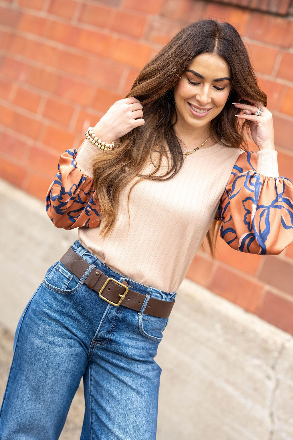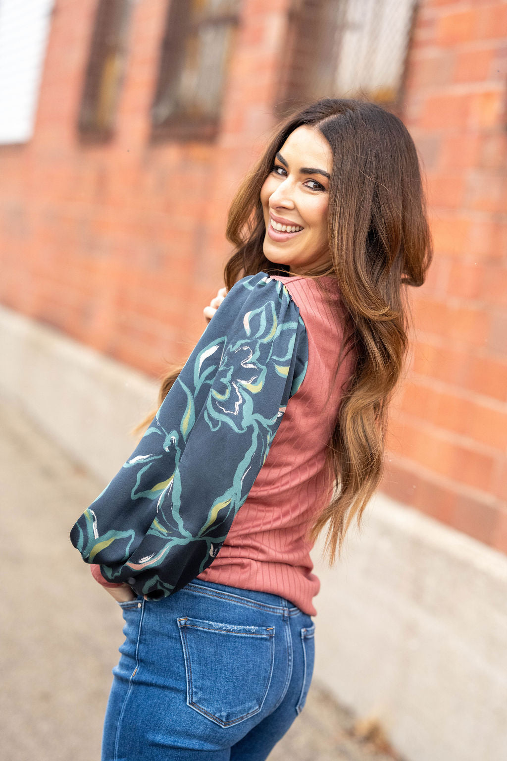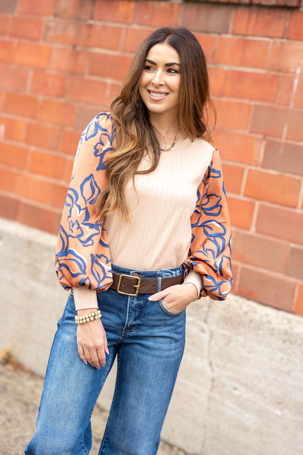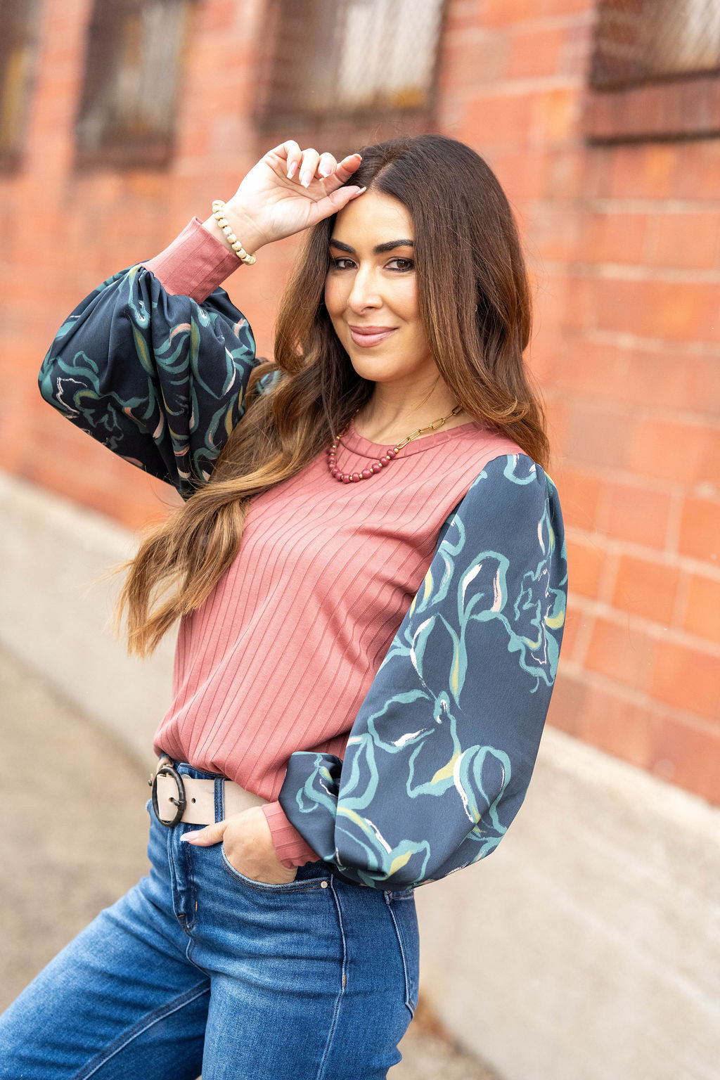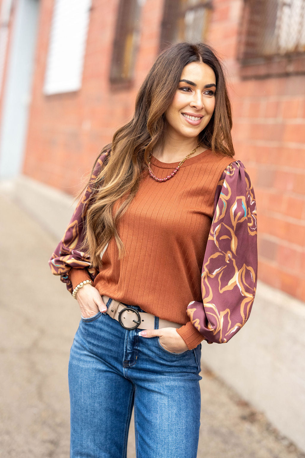 Bring a bold, beautiful twist to your everyday style with this mixed-sleeve statement top. The ribbed knit bodice offers a soft, flattering fit, while the patterned balloon sleeves add the perfect pop of color and movement.