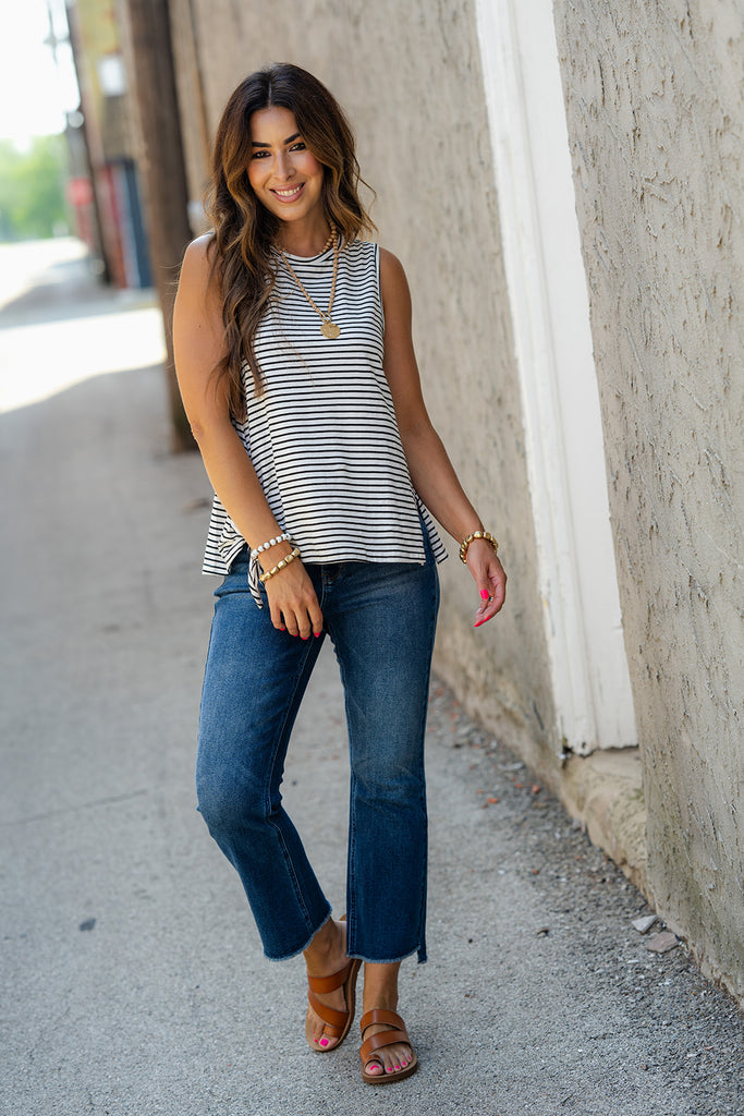 Tanks are a staple piece in every wardrobe because you can wear them year-round. Wear them during warm months as well as layer with them in cold months. We love the simplicity of this tank. The stripes and side knot set this tank apart from others. Pair with a cardigan on cold days for warmth and added style!