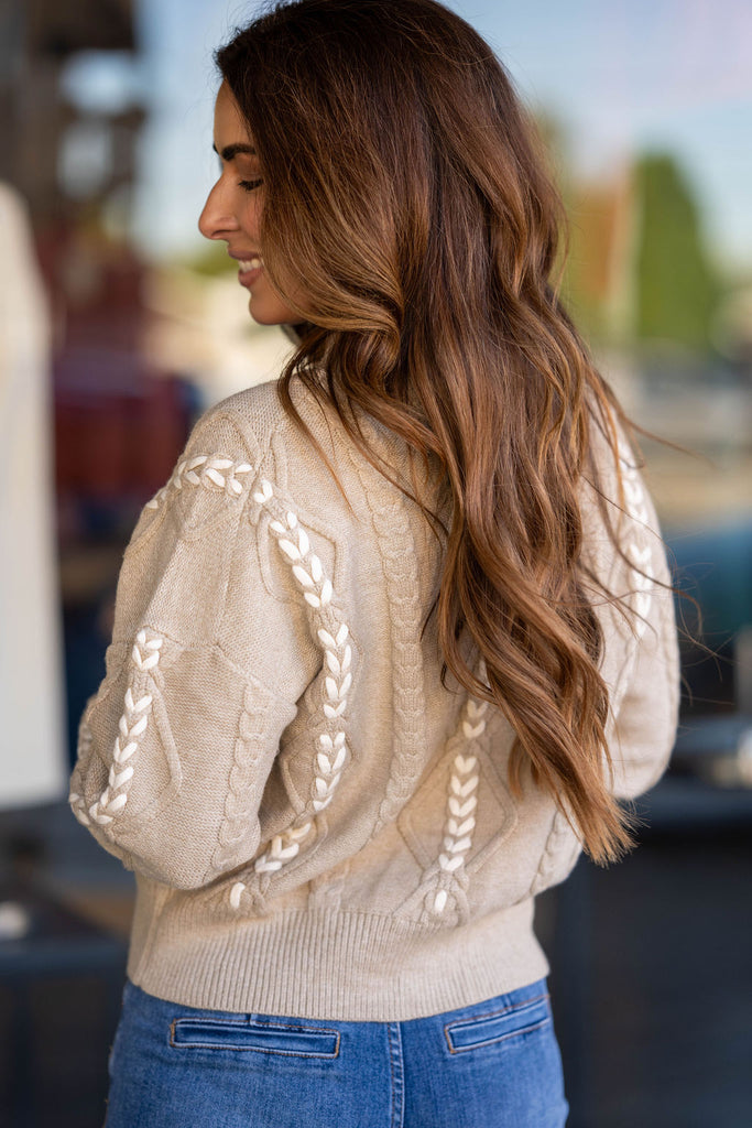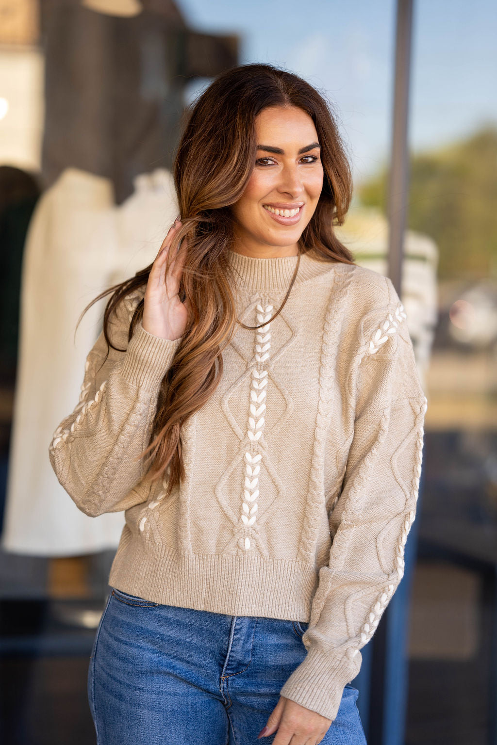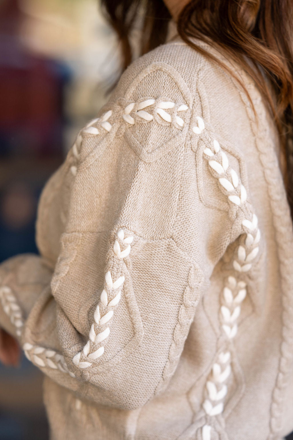 A cozy statement piece that blends timeless cable stitching with soft, modern texture. The delicate braided detailing adds just the right amount of charm, making this sweater perfect for layering or standing out on its own. Designed for all-day comfort with a relaxed, flattering fit.