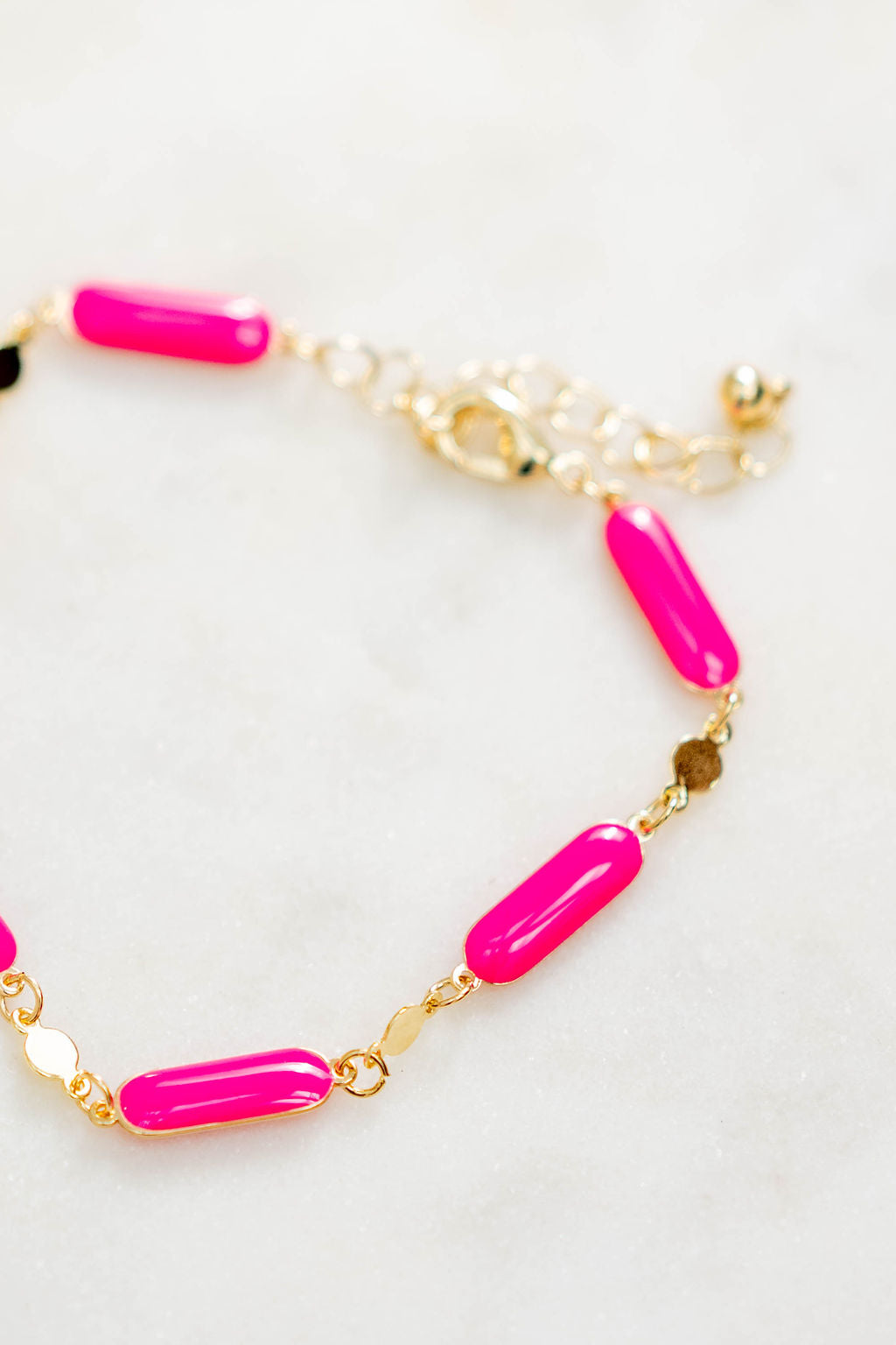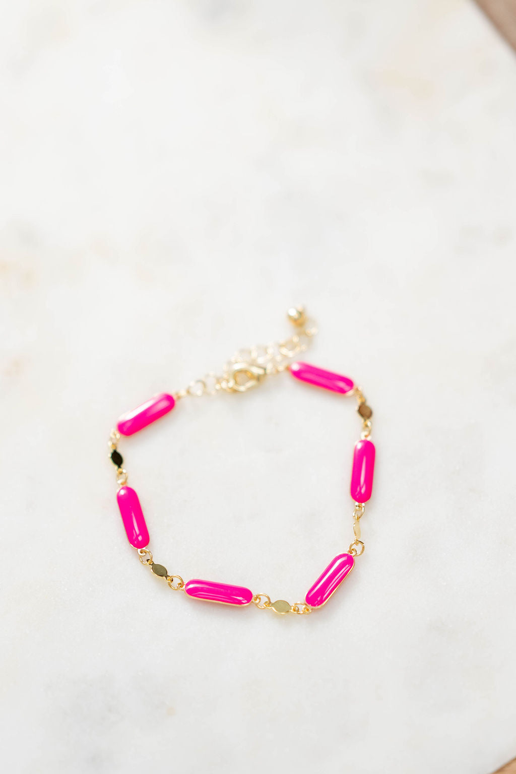 This necklace is bold, chic, and full of personality. Designed with glossy fuchsia beads linked by delicate gold connectors, this piece brings instant energy to your wrist. Wear it solo for a pop of color or pair it with the matching necklace for a striking set that screams confidence and fun.