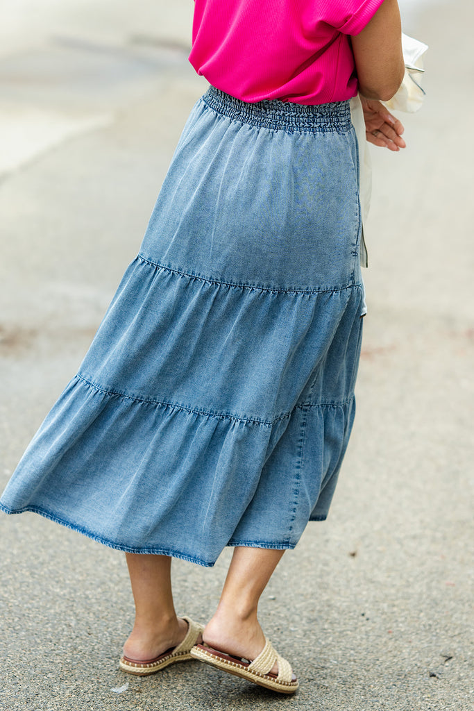 We cannot get over how stylish this skirt is! The classic denim look and tiered style fit makes such a cute, elegant look! Wear this skirt to any event and you are sure to receive compliments! We love tucking a blouse into this for a more elevated look or a basic or graphic tee for a casual feel!