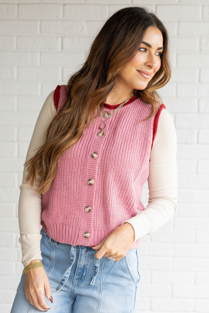 Layering just got a whole lot cuter. This textured knit vest features a two-tone design with contrast edging and a full button front for a look that’s equal parts playful and polished.