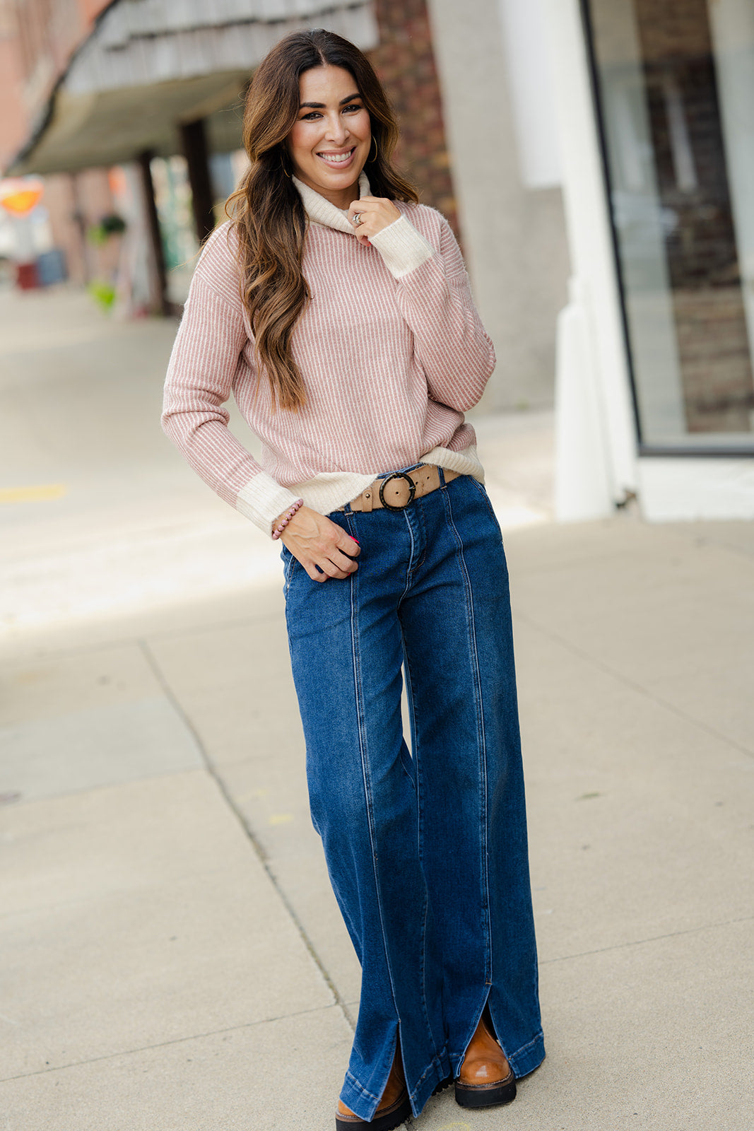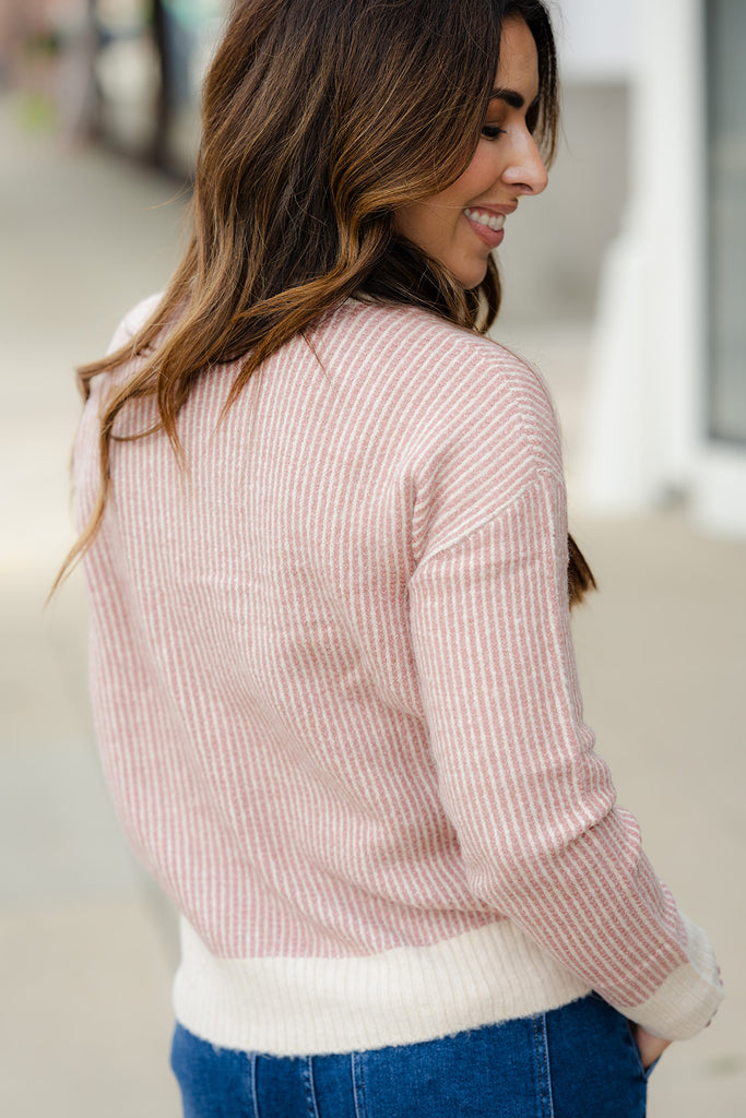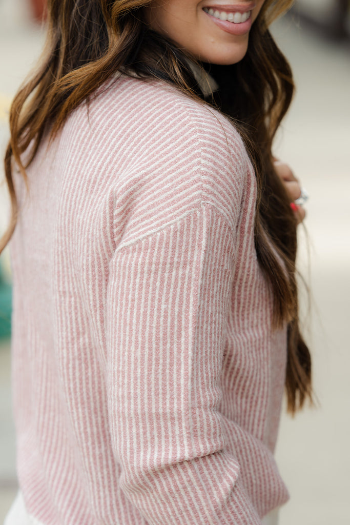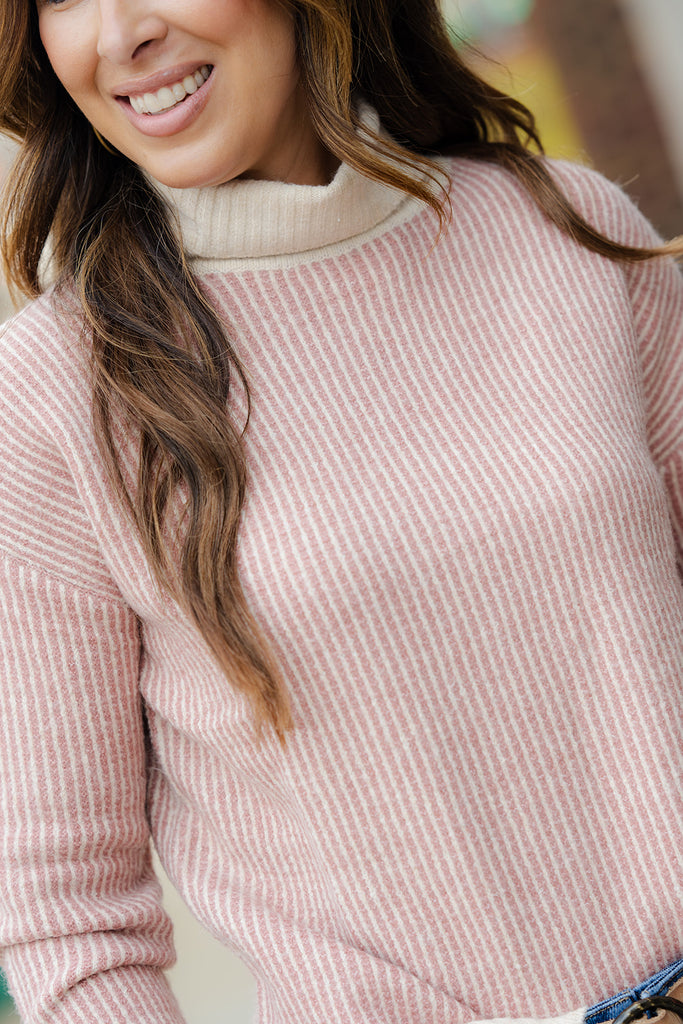 Sweater weather is upon us and we're in love with this one! The stripes and the cowl neck detailing are so chic! Pair this sweater with jeans, accessorize and add your favorite pair of shoes for a quick, stylish look! Chilly? Add a vest or jacket with ease!!