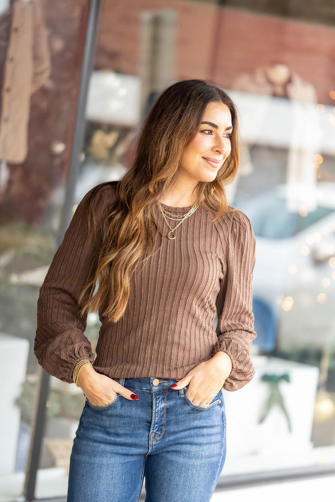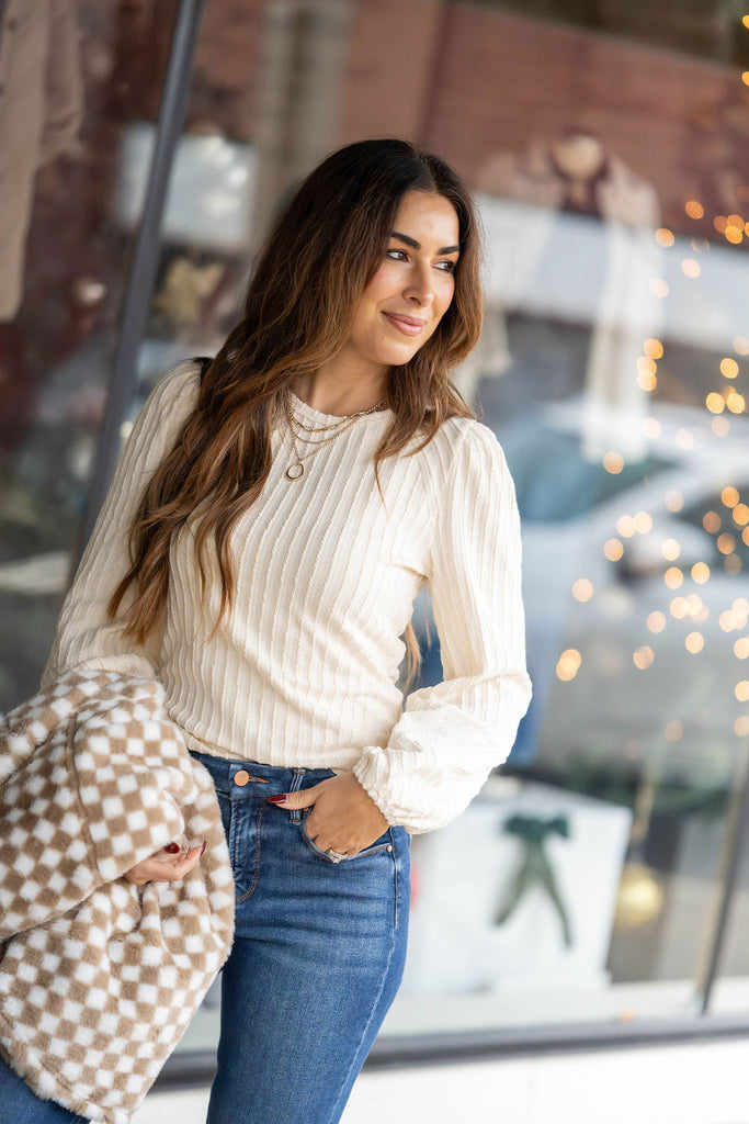 Elevate your everyday style with this beautifully textured knit top. Designed with a subtle wave pattern and elegant puff sleeves, it strikes the perfect balance between polished and effortless.