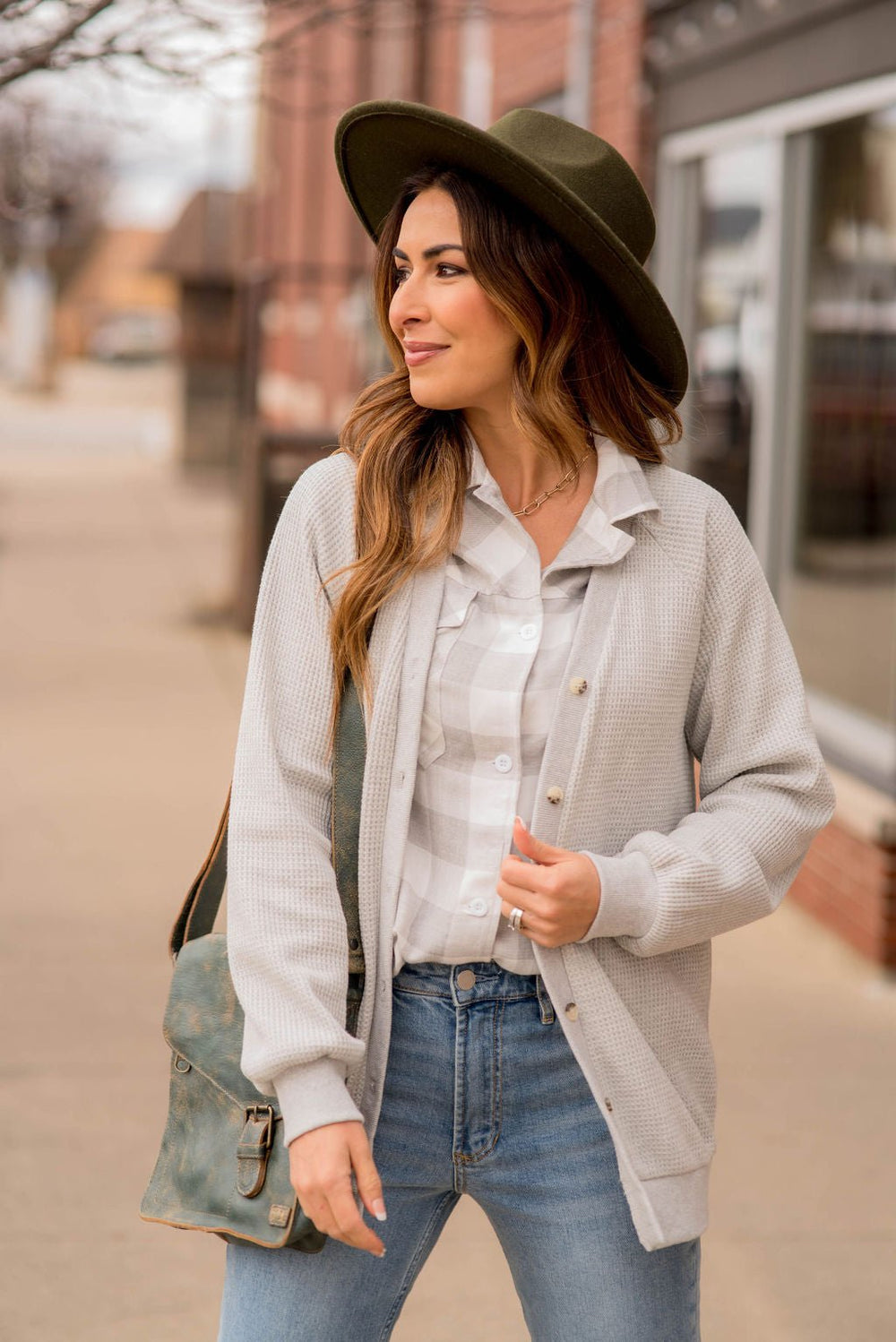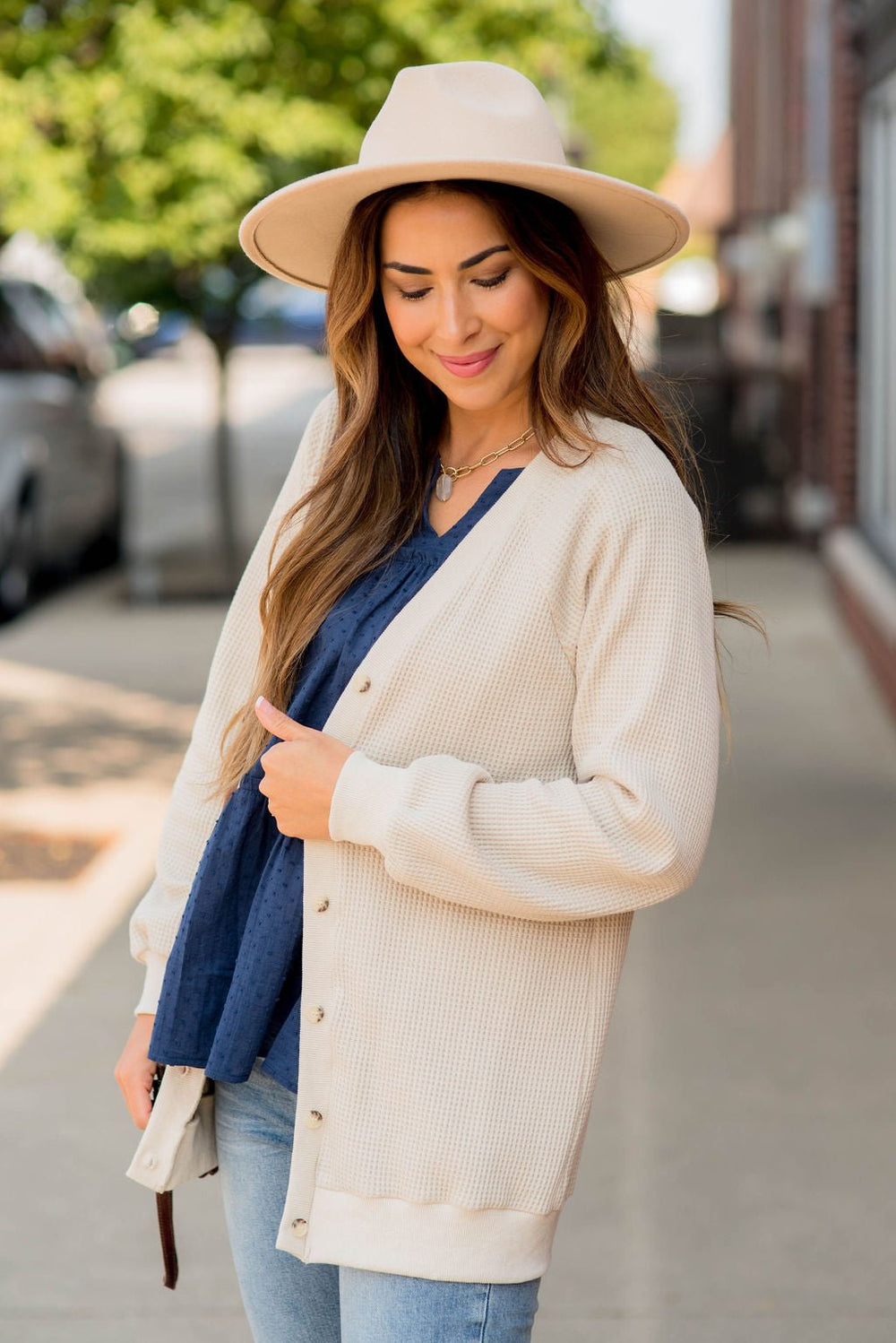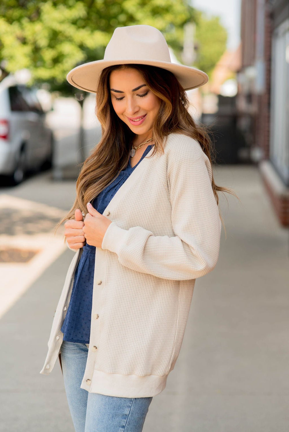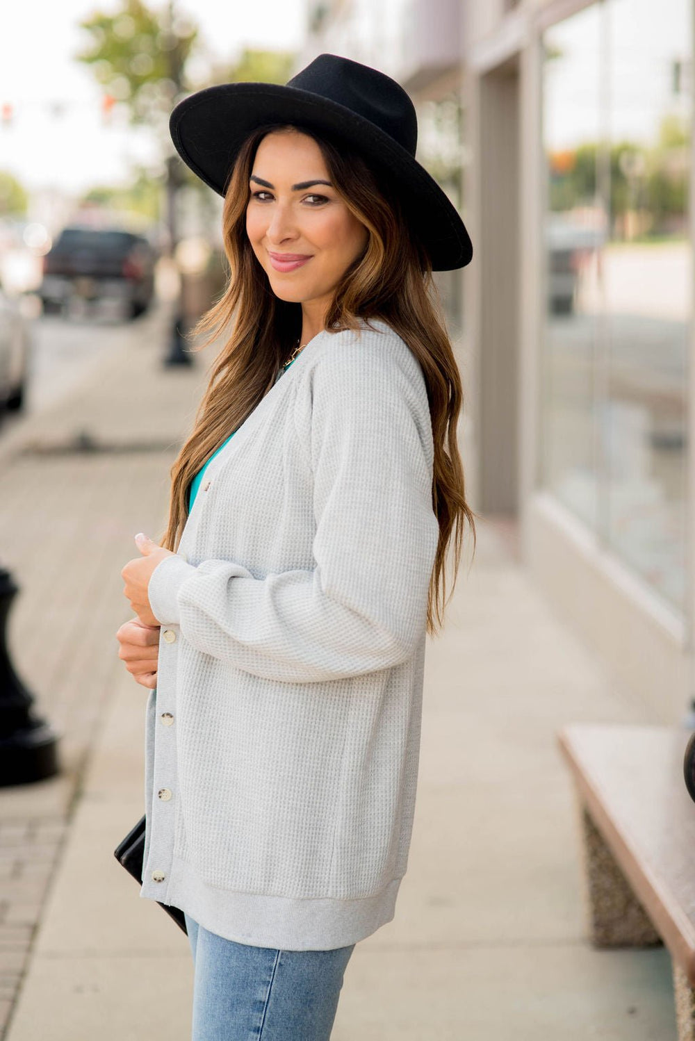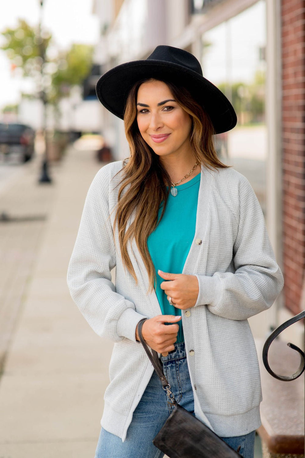 The waffled material against the solid trim really makes this cardigan pop! We're loving the button accents for that little bit of extra detailing! Pair with a basic tee and leggings or denim for a quick and easy on-the-go look or layer with your favorite blouse for the office or the classroom!