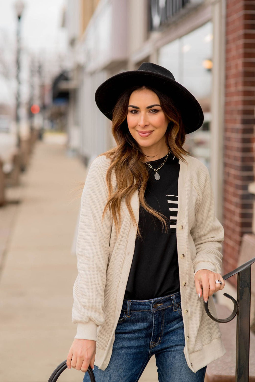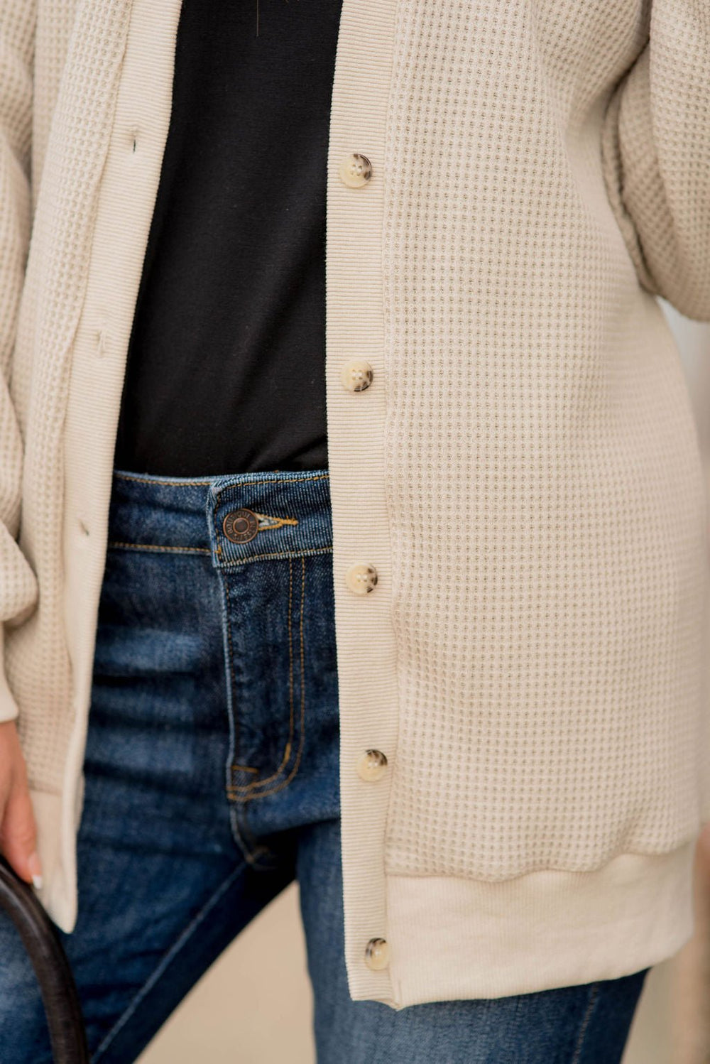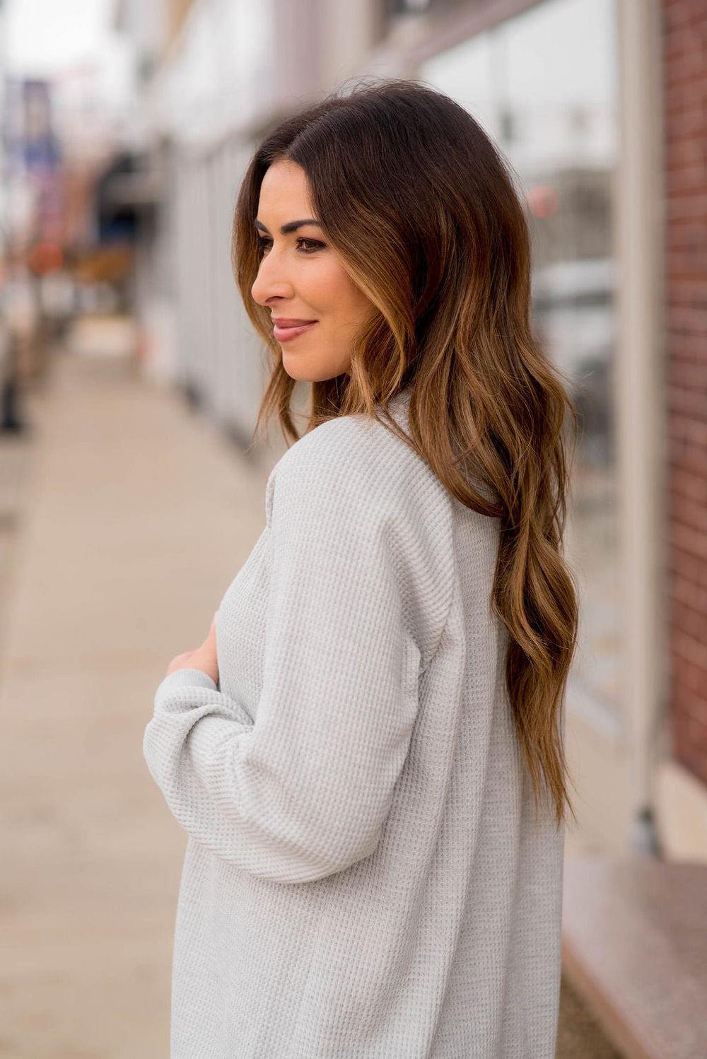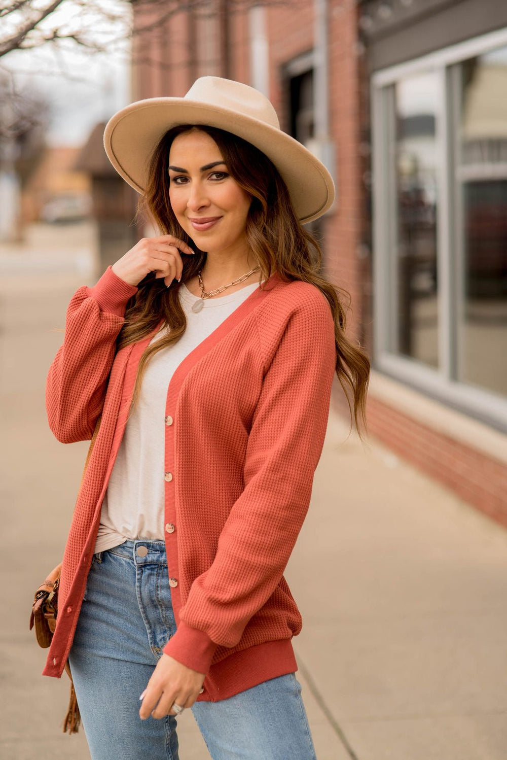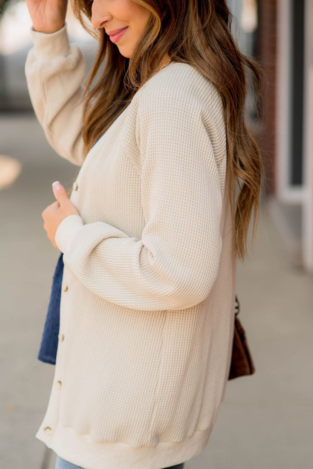 The waffled material against the solid trim really makes this cardigan pop! We're loving the button accents for that little bit of extra detailing! Pair with a basic tee and leggings or denim for a quick and easy on-the-go look or layer with your favorite blouse for the office or the classroom!