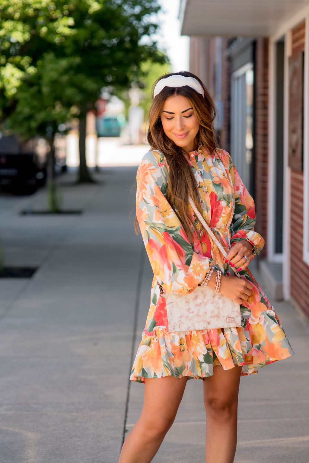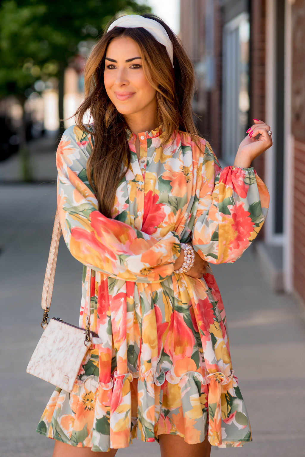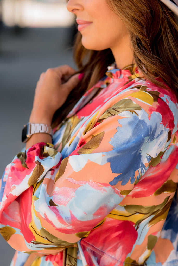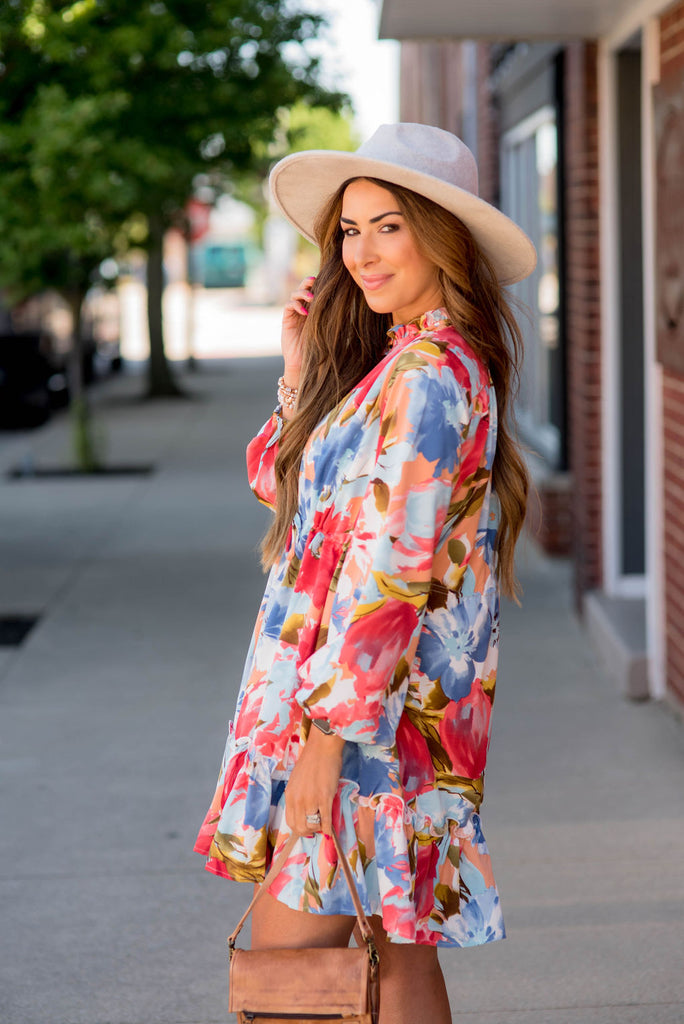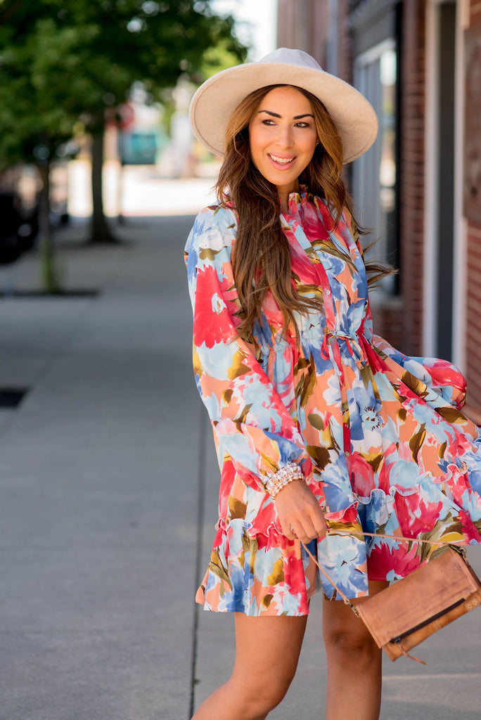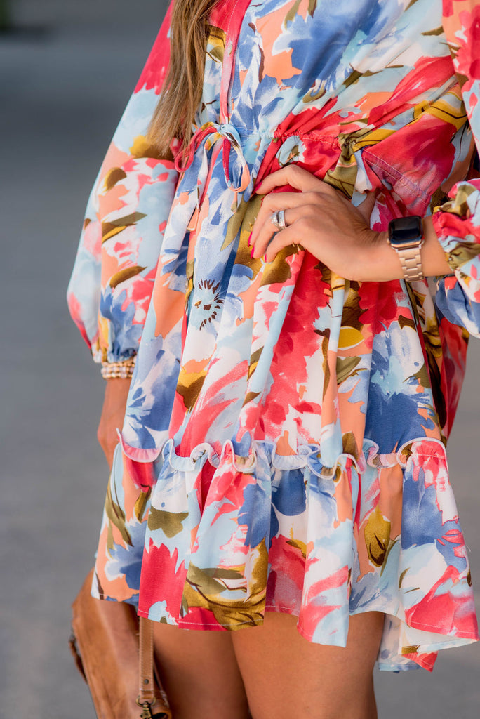 So many things to love about this dress! The watercolor floral print, the button accents, the flowy and lightweight material that is tied around the waist for a slimming effect, and the fun ruffle bottom! Wear this in the warmer months with a pair of wedges or sandals or pair with leggings and boots for the cooler ones! We just know that you will be turning heads in this one!
