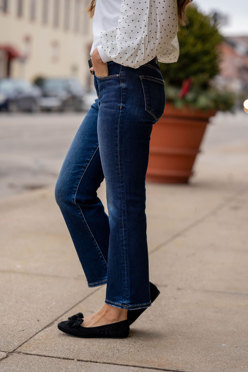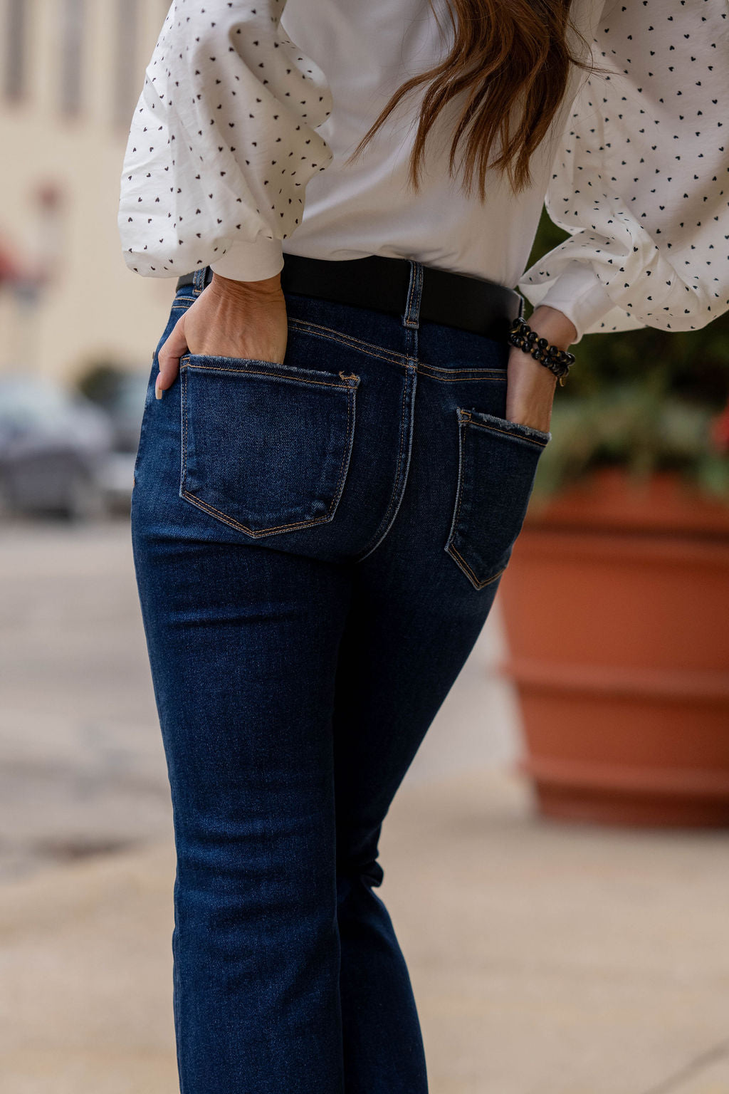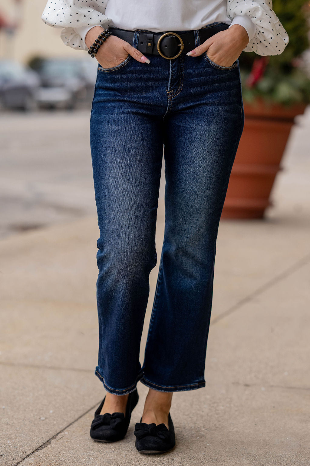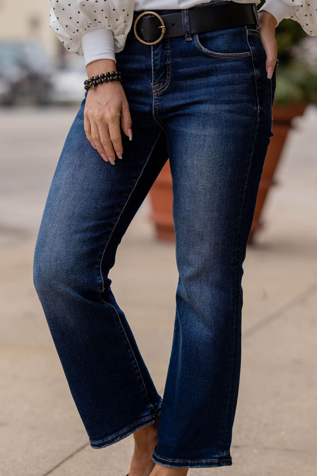These jeans are the perfect blend of comfort and everyday polish. Designed with a subtle flare leg, they give you that modern, balanced silhouette that works with every shoe in your closet. The dark wash keeps them sleek and versatile, making them ideal for dressing up or keeping casual.