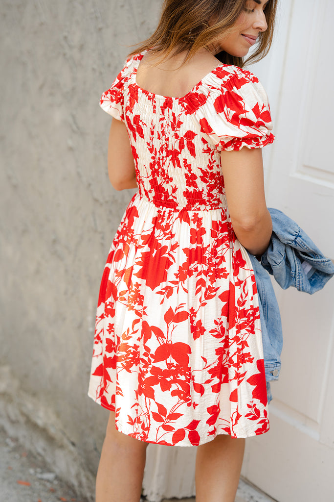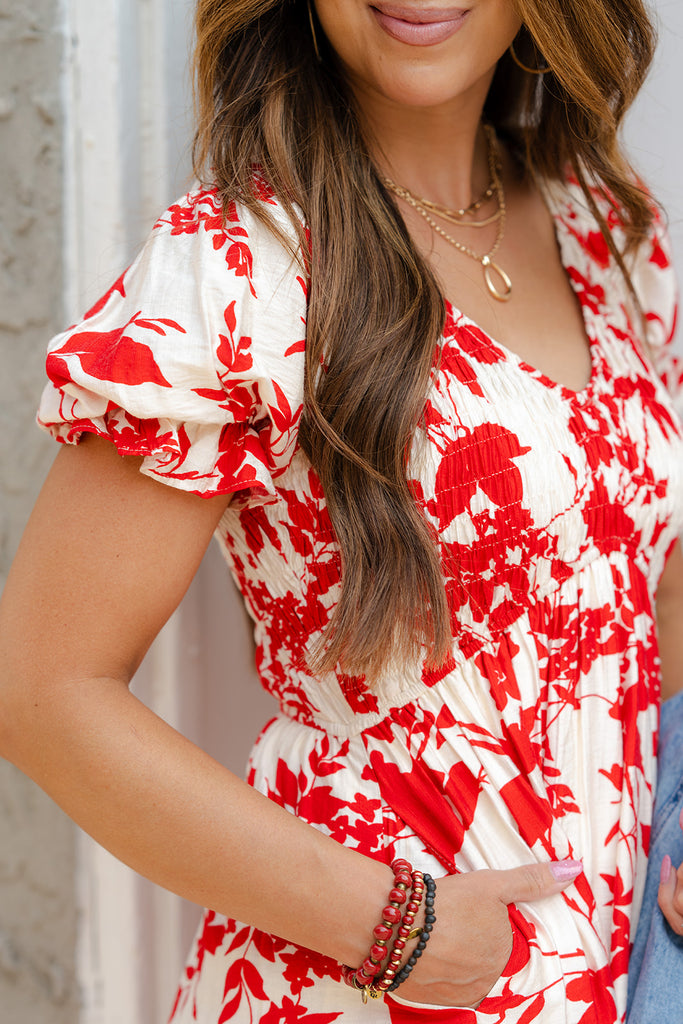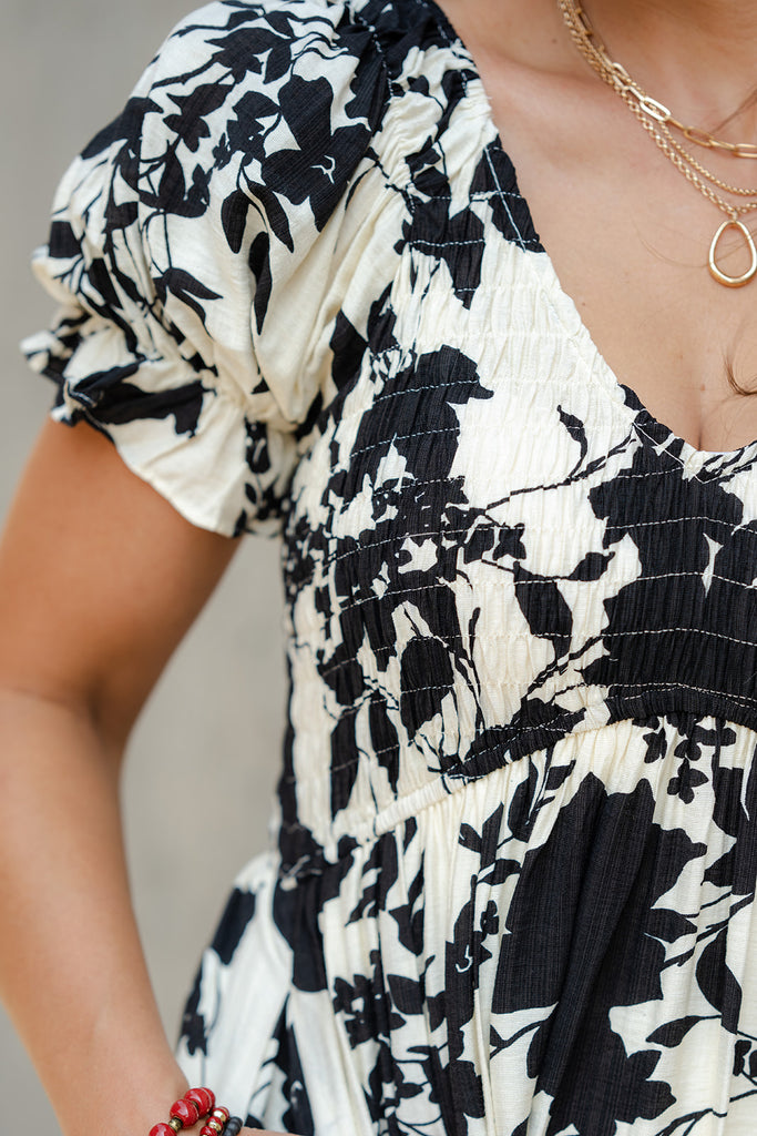 This dress gives us major feminine and flirty vibes! The lightweight and breathable material and flowy fit makes it ideal for those hot days but this can just as easily be layered with a cardigan or denim jacket and boots! The smocked top against the flowy bottom gives a nice slimming effect and we're loving the puff sleeves and the stunning floral print to set it apart from the rest!