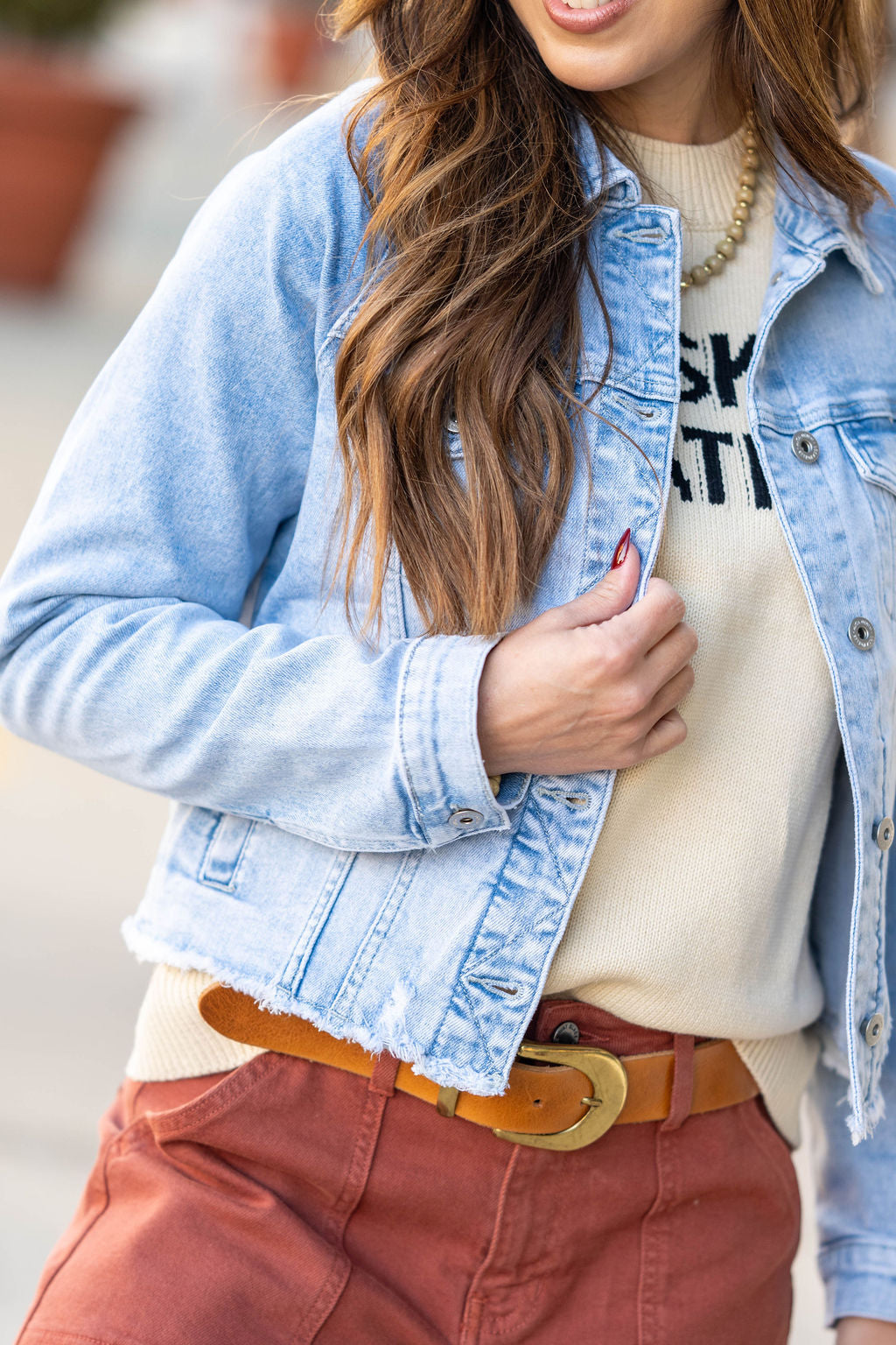This denim jacket is a forever favorite—crafted with the perfect mix of structure and softness for everyday wear. The slightly cropped fit and raw hemline give it a laid-back yet modern edge.